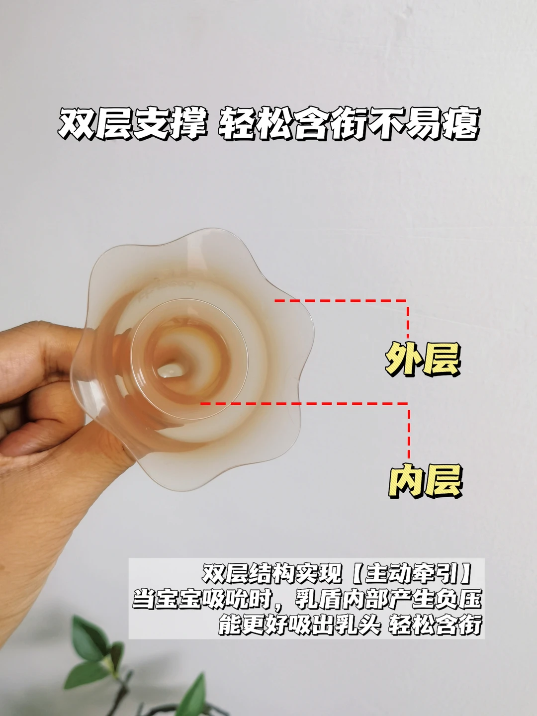 而且双层结构能轻松实现【主动牵引】,宝宝👶🏻吸吮时,乳盾内部产生负压,能更好地吸出奶水,宝宝喝着开心,妈妈也不用再忍受皲裂痛苦