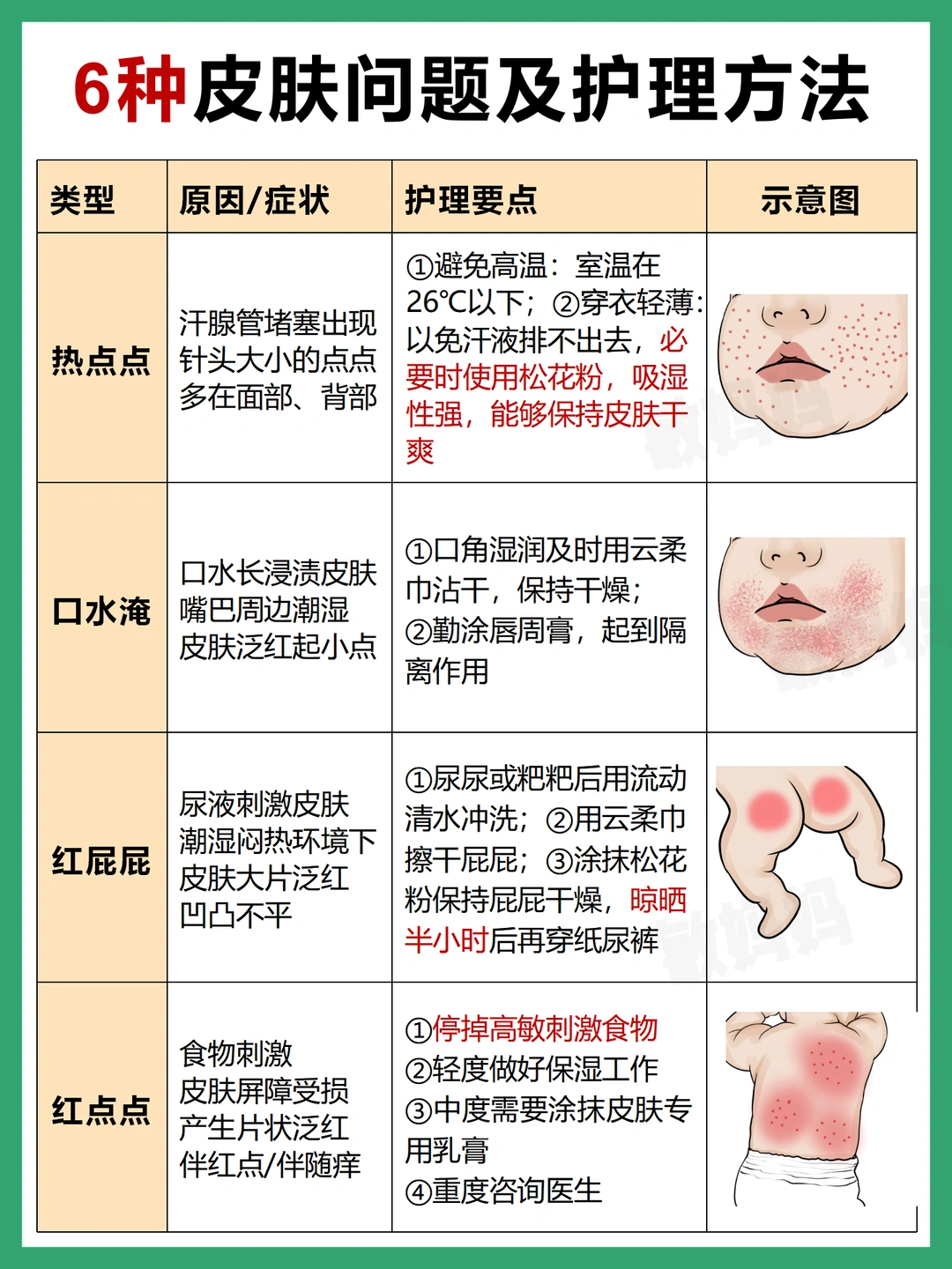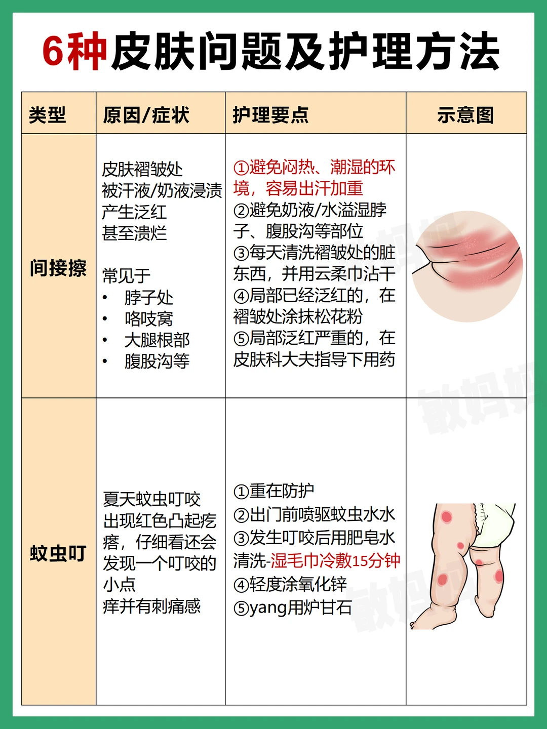 这6类皮肤问题干货图都有详细讲解,如何护理也都标注了~心细的妈妈👩🏻看下来会发现,皮肤保持干燥、做好汗液隔离,基本能杜绝很多小问题发生