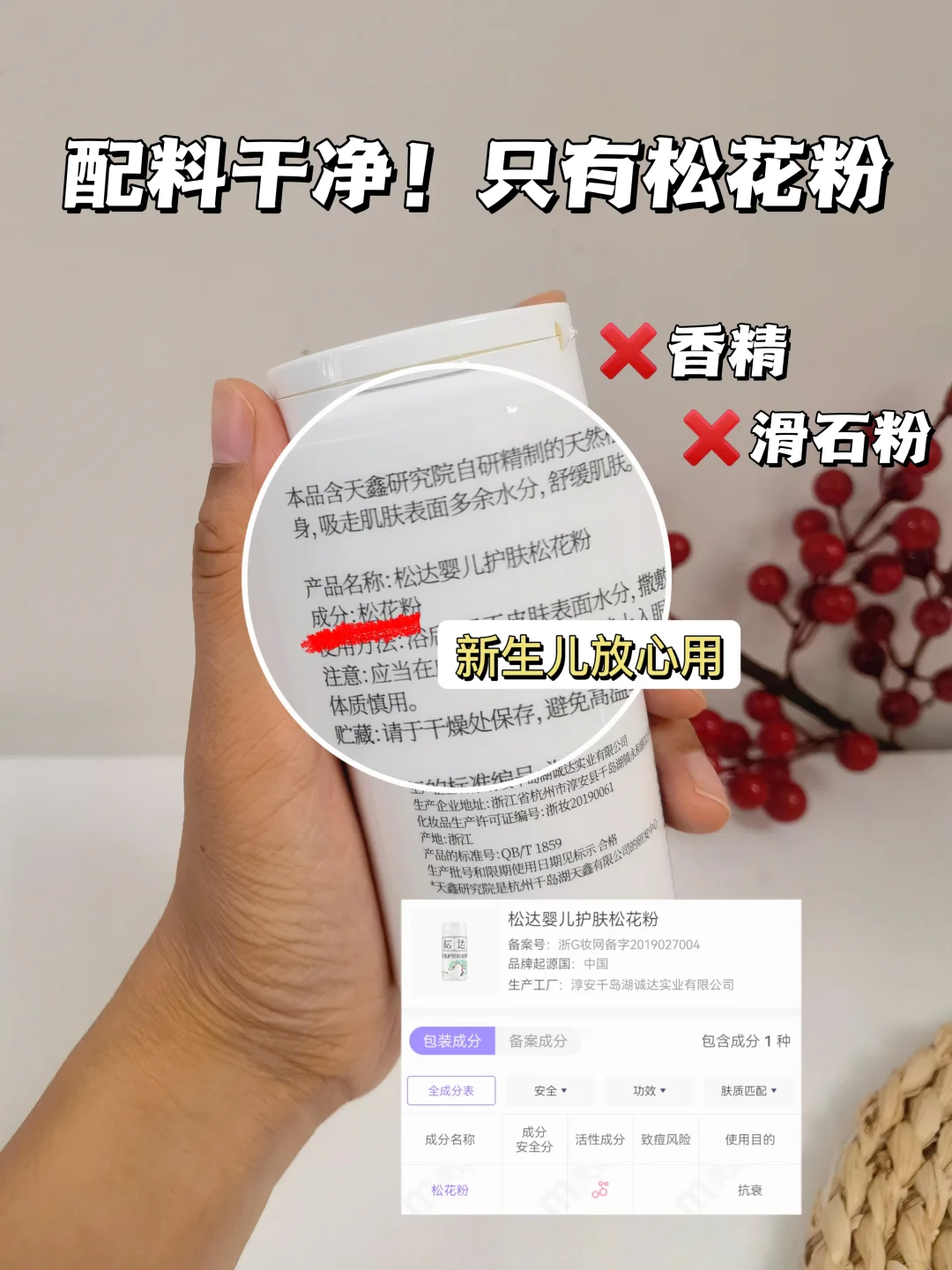 松达松花粉的成分只有一种,就是由天然松树花粉精制而成的松花粉,没有滑石粉、香精、色素这些乱七八糟的添加,成分简单,可以放心给新生宝宝用。