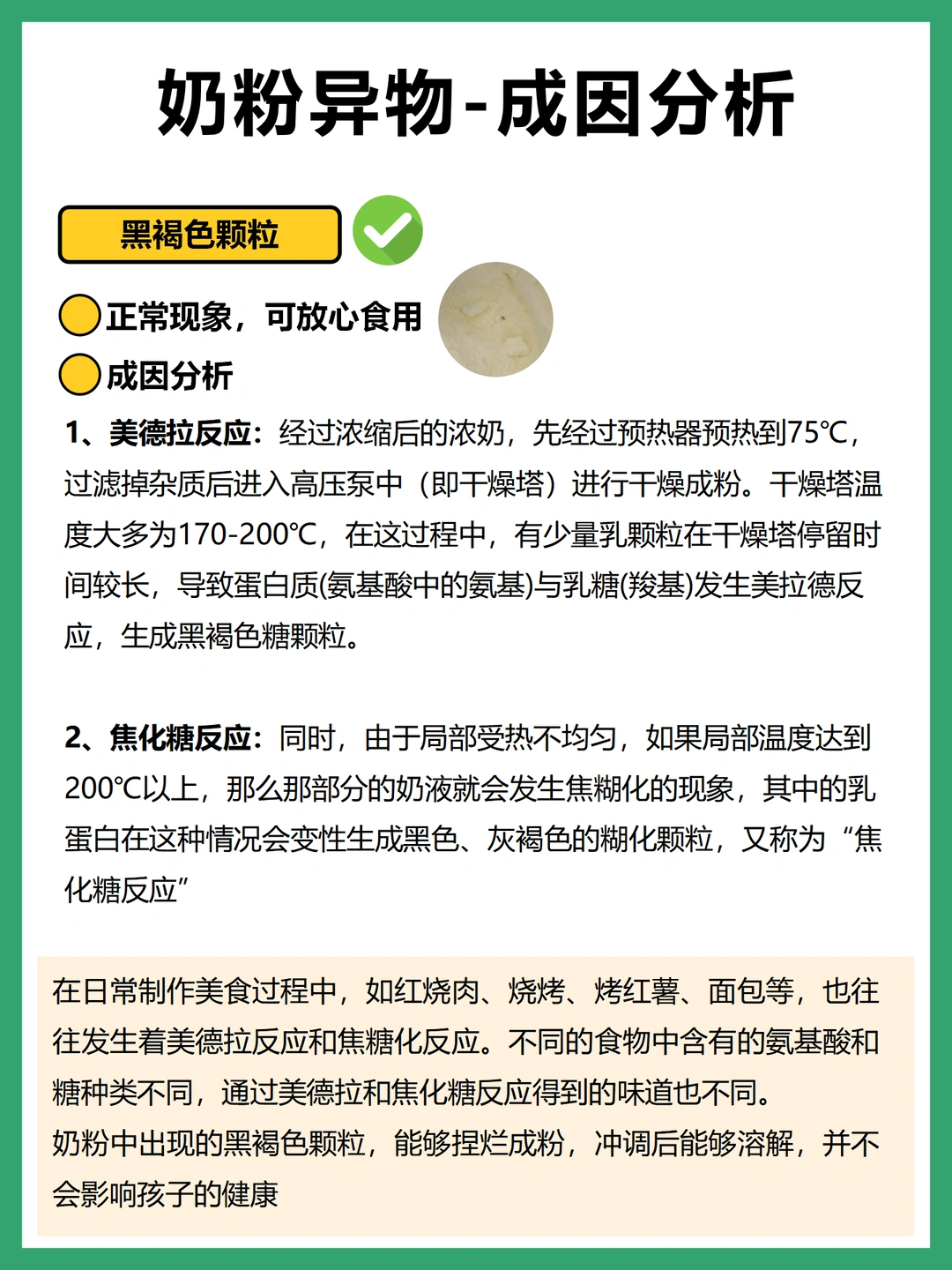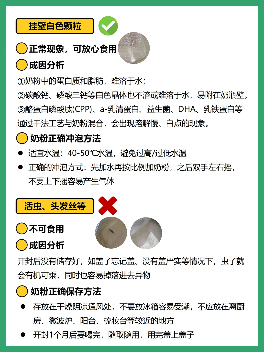 很多妈妈碰到奶粉中的异物往往会非常慌乱😨,直接把奶粉全都倒了,其实我们需要辩证看待,奶粉中出现的是哪种异物?这种异物产生原因是什么?再来看是否可食用。相关的资料我都整理在图中了,妈妈们可以对照查证