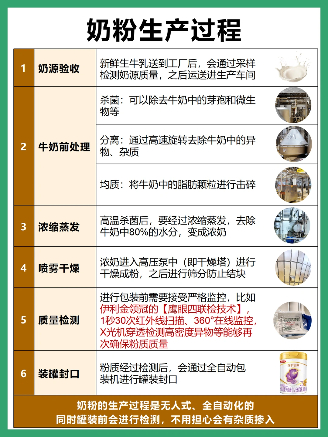 现在奶粉生产车间都是医药级无菌环境,生产过程也都是无人化、全自动机器操作。从新鲜生牛乳到制作成粉,需要经过层层工序
