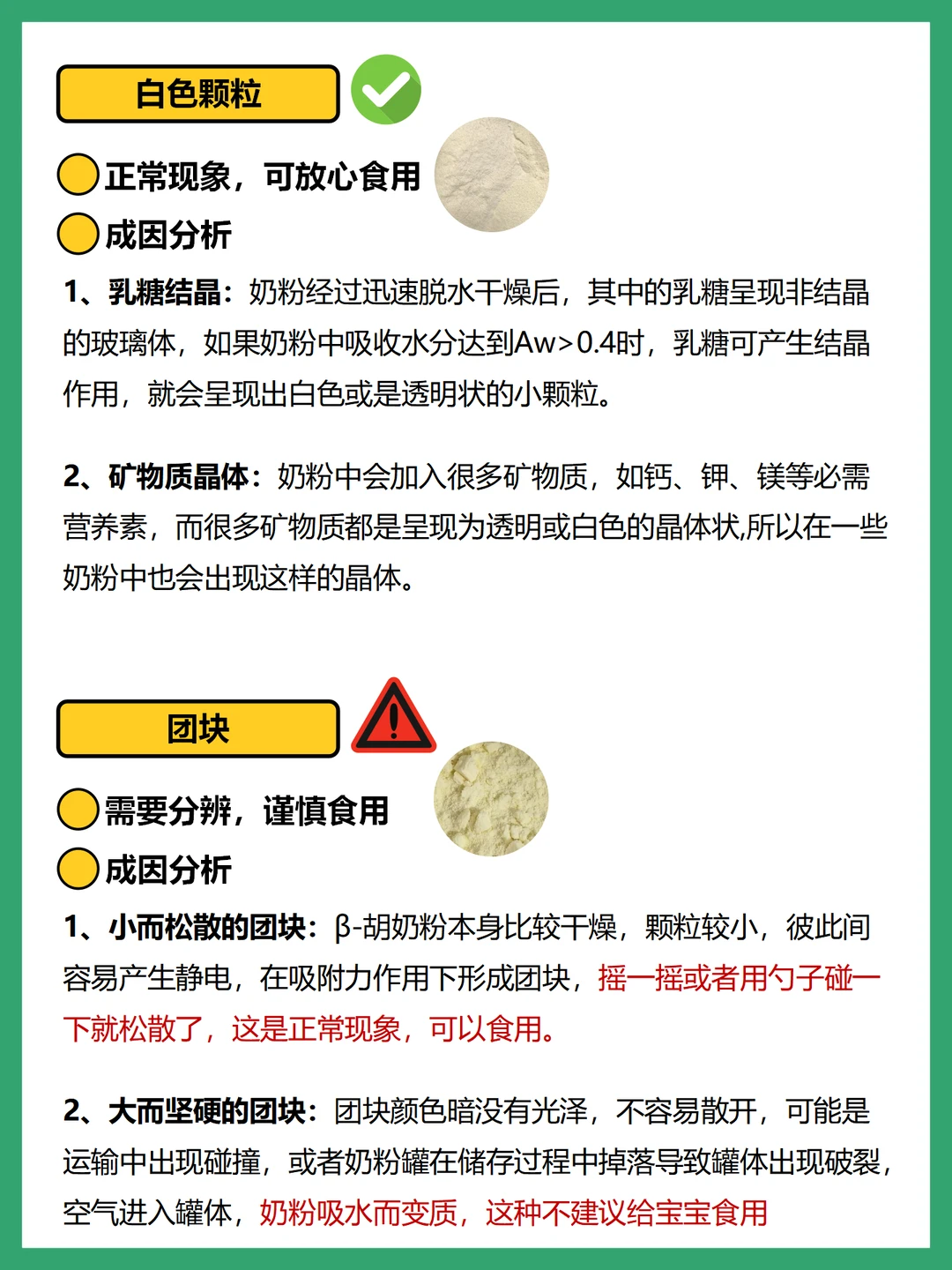 ⭕团块:静电吸附会导致小而松散的团块,没有保存好奶粉潮湿进水会结成大而坚硬的团块