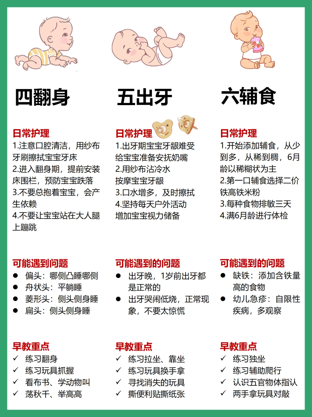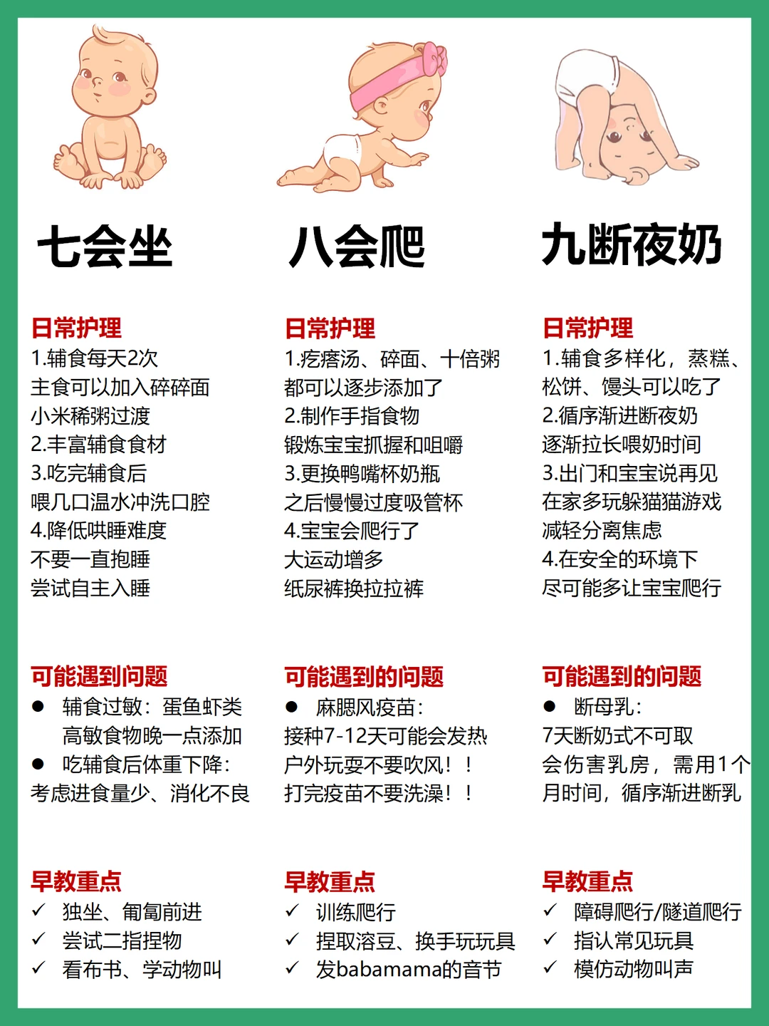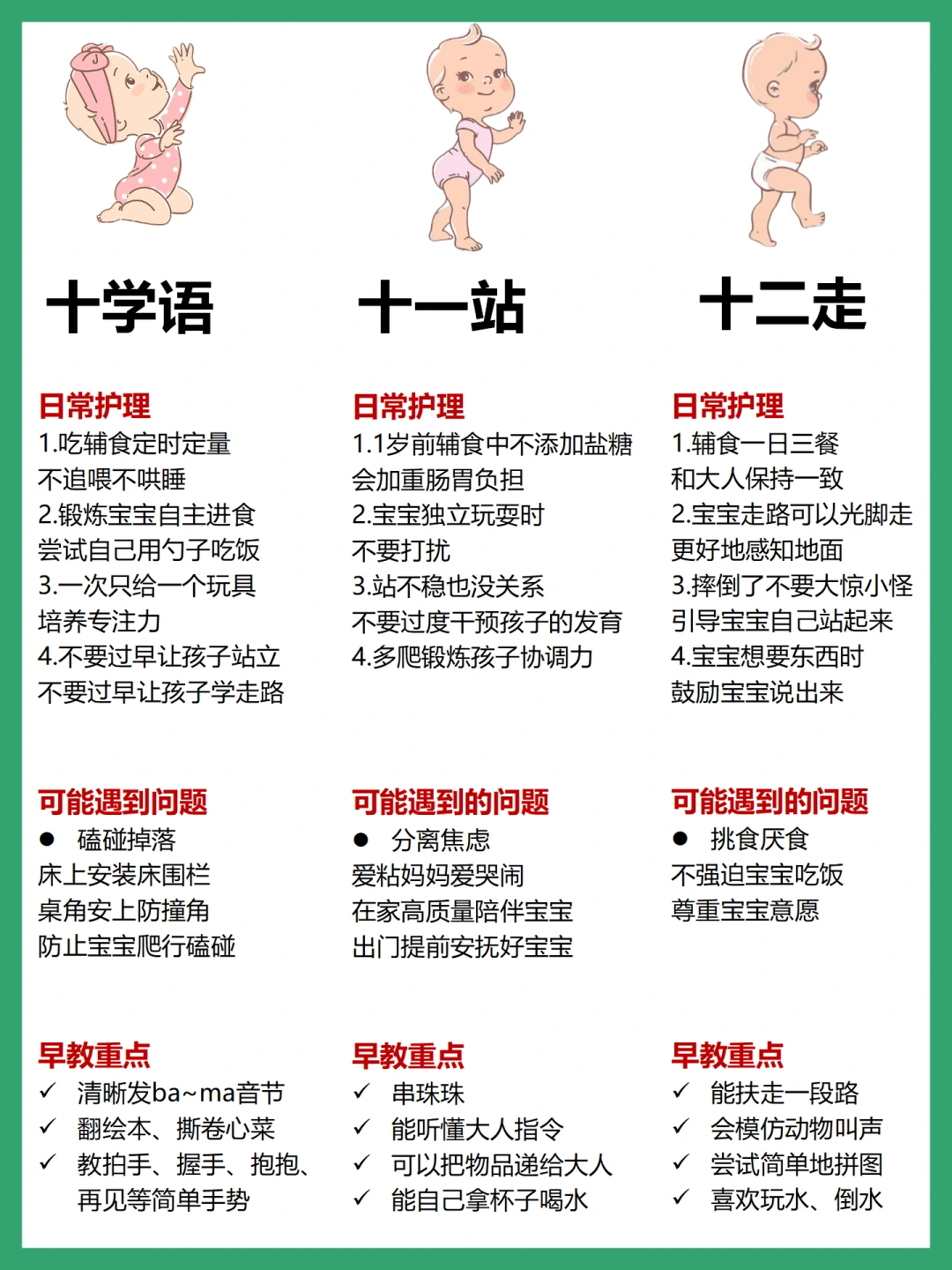 这篇总结了各月龄宝宝的日常护理、可能遇到问题及早教重点,帮助新手妈妈科学育儿~