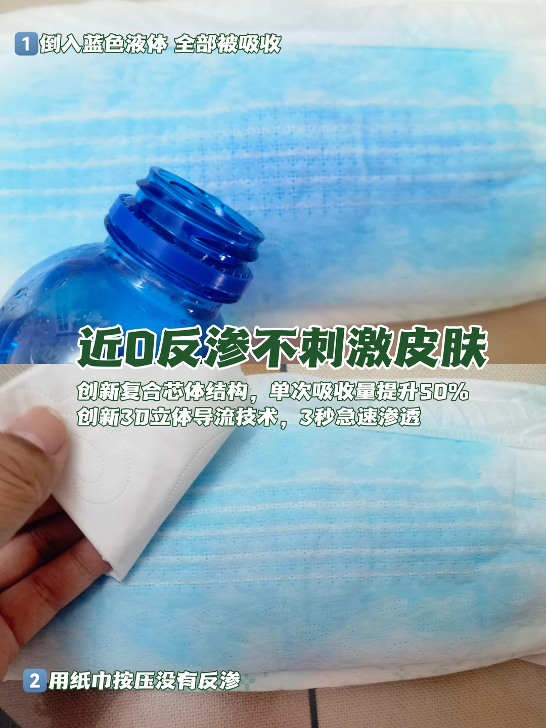 而且它的芯体使用12微米超细旦纤维,相当于头发丝的千分之一,捏在手里棉软软的,吸水性能也不错,0.2cm超导芯1000ml海量鲸吸,近0反渗,不怕尿液残留在宝宝皮肤~就算是尿霸宝宝一整晚🌗都不怕!