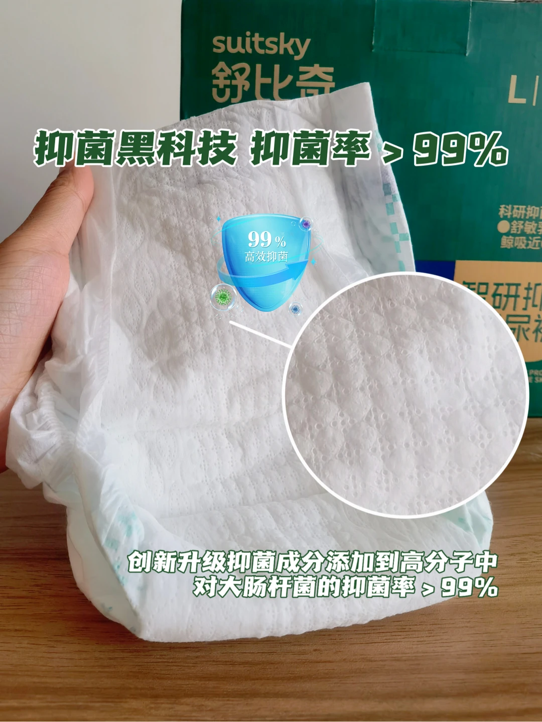 重点是‼️智研抑菌这款纸尿裤,它在芯体中添加了抑菌分子,能抑制住尿便中的大肠杆菌繁殖率‼️抑菌率达99%