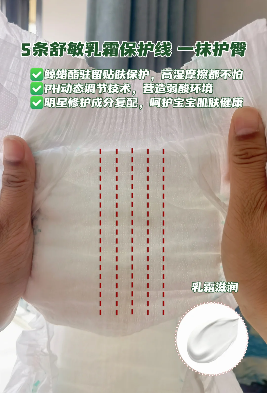 不止如此,每片还添加了5⃣️条舒敏乳霜保护线,相当于给PP加了一层保护隔离油,自然不怕尿液刺激~不愧是敏感肌纸尿裤开创者!