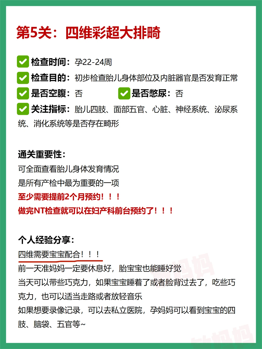 查看胎儿四肢、面部五官、心脏、神经系统、泌尿系统、消化系统等是否存在畸形,建议提前2个月预约!NT检查后就可以在妇产科前台预约了!