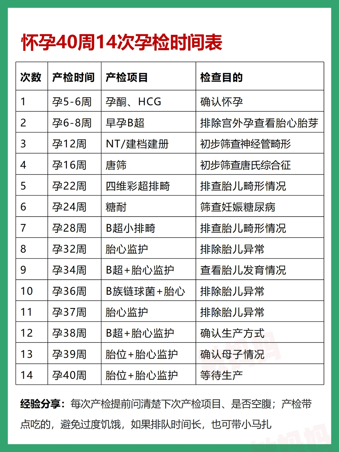 整个孕期大概需要产检14次,以上7次是比较重要的,希望准妈妈们都能顺利闯关,产检一路绿灯,生下健健康康的小宝宝~