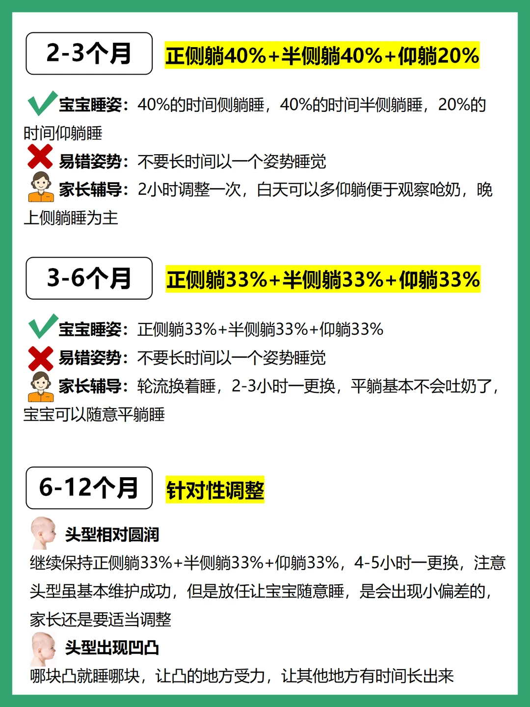 2-3个月:正侧躺40%+半侧躺40%+仰躺20%