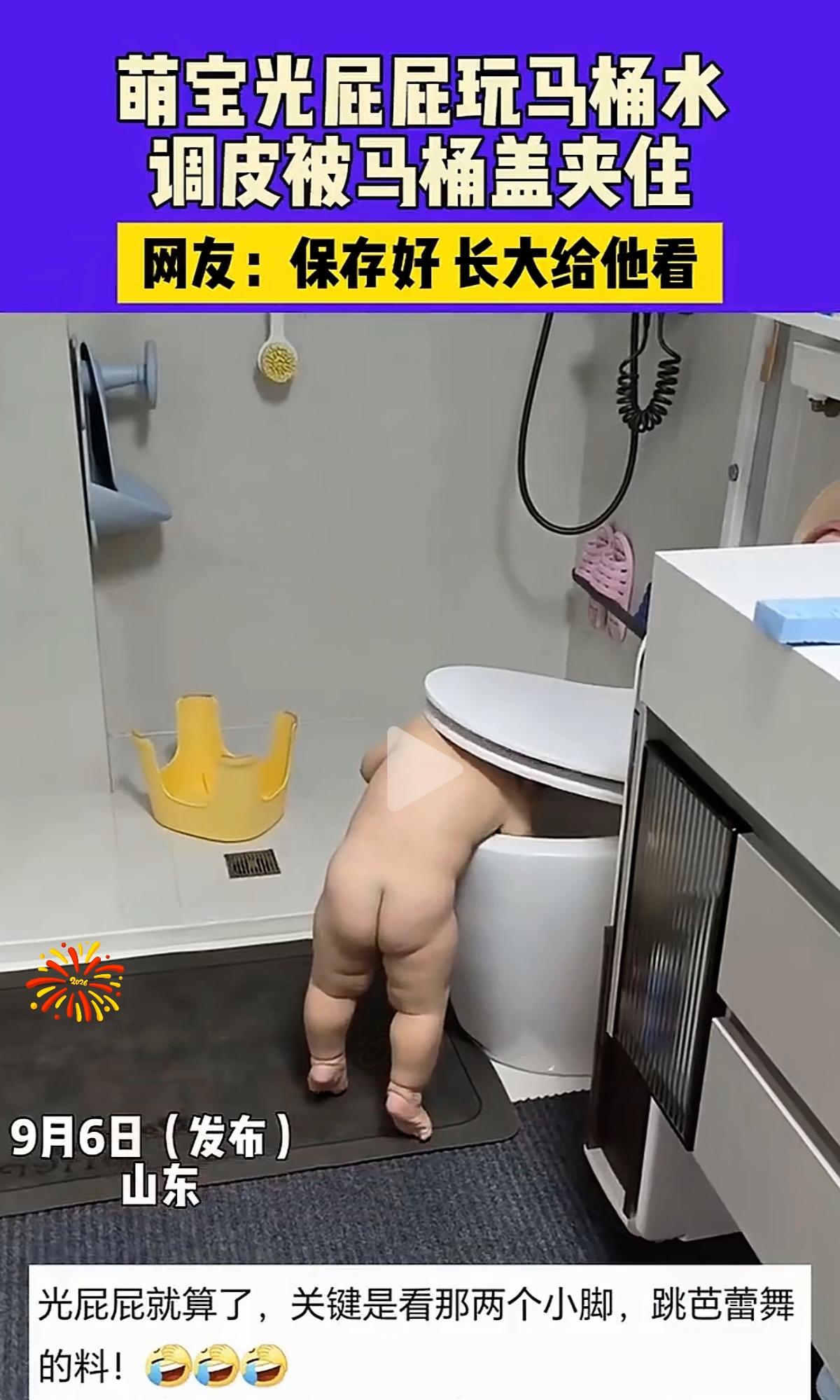 萌宝玩马桶水被盖子夹住!家不是安全区,家长别大意! 看得人手心冒汗!萌宝光屁股扒着马桶玩水,结果被突然落下的马桶盖夹住,想想都心疼又后怕。 很多家长觉得家里最安全,对卫生间的隐患完全不上心,可对好奇心爆棚的宝宝来说,马桶就是“危险陷阱”。马桶水里藏着大肠杆菌、金黄色葡萄球菌,接触了容易拉肚子、皮肤感染,更别提无阻力的马桶盖,轻则夹伤手脚,男宝还可能伤到生殖器后果真的严重。你家孩子调皮吗
