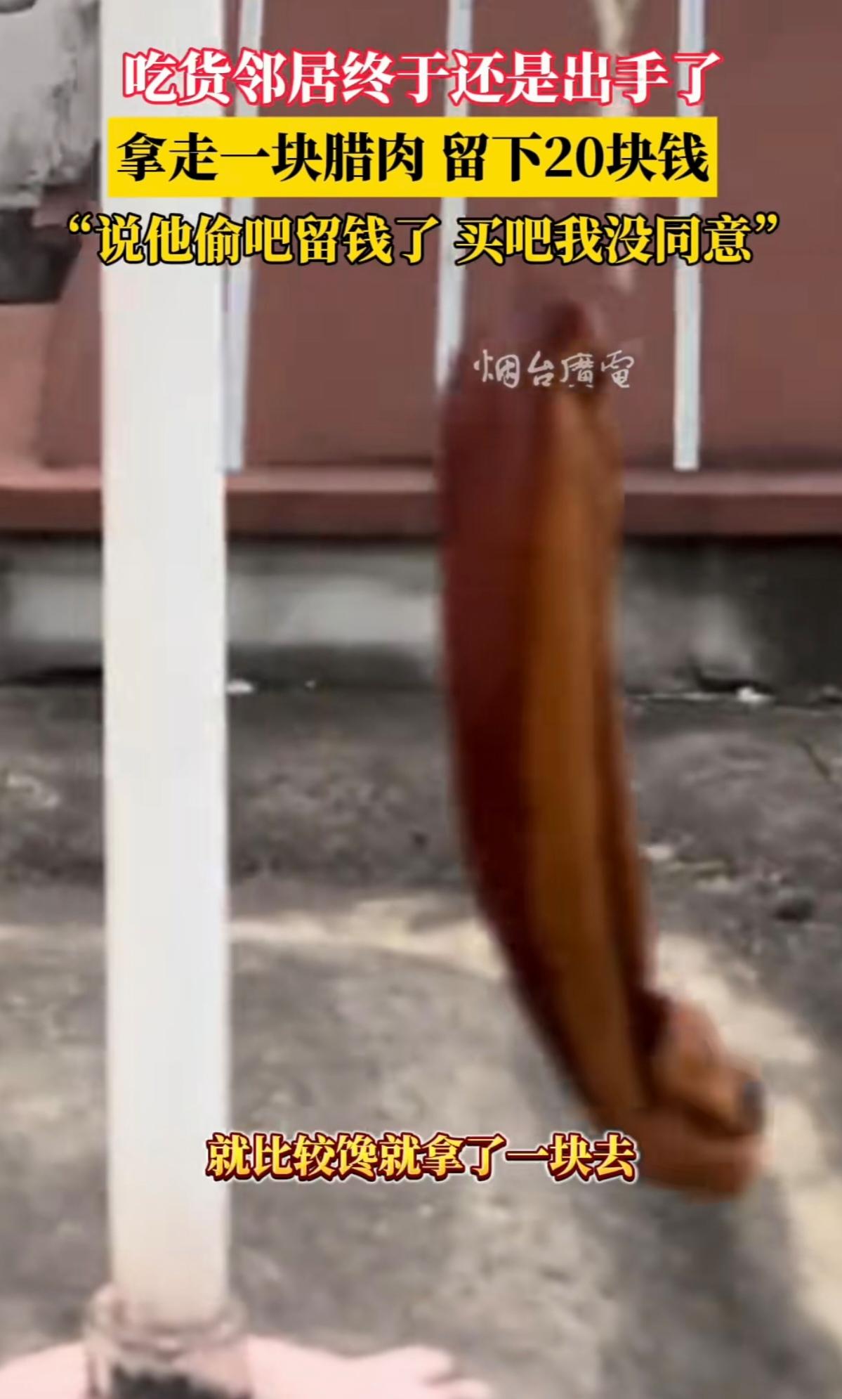 在吃货的眼里,只要是美食,就会嘴馋。一女士在小区楼顶晒了一排腊肉,等她后续再去查看的时候,发现多了一张20元的纸币,但是却少了一块腊肉。 这让她哭笑不得!说拿走腊肉的人偷肉吧,他却付了钱。说是他买的吧,可晒腊肉的人,没同意卖给他。 只能说,这位女士制作的腊肉,估计很正宗。让经过楼顶的某位邻居嘴馋了,于是以一张20元的纸币,换了一块腊肉。 但是,个人认为这种行为,不值得提倡。如果确实喜欢吃腊肉,可以想办法寻找晒腊肉的人。然后跟她协商购买,而不是私自把人家的肉拿走。 当然,拿走这块肉的人,也没完全占小便宜,毕竟人家还是放了20元钱的。并不是直接顺手牵羊拿走。这比顺手牵羊,直接顺走的人,要好上不少。但这种行为,也是不值得提倡的。