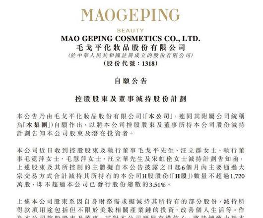 毛戈平上市月余拟减持,千亿冻资神话后资本走向引关注 6名核心股东拟半年内最多减