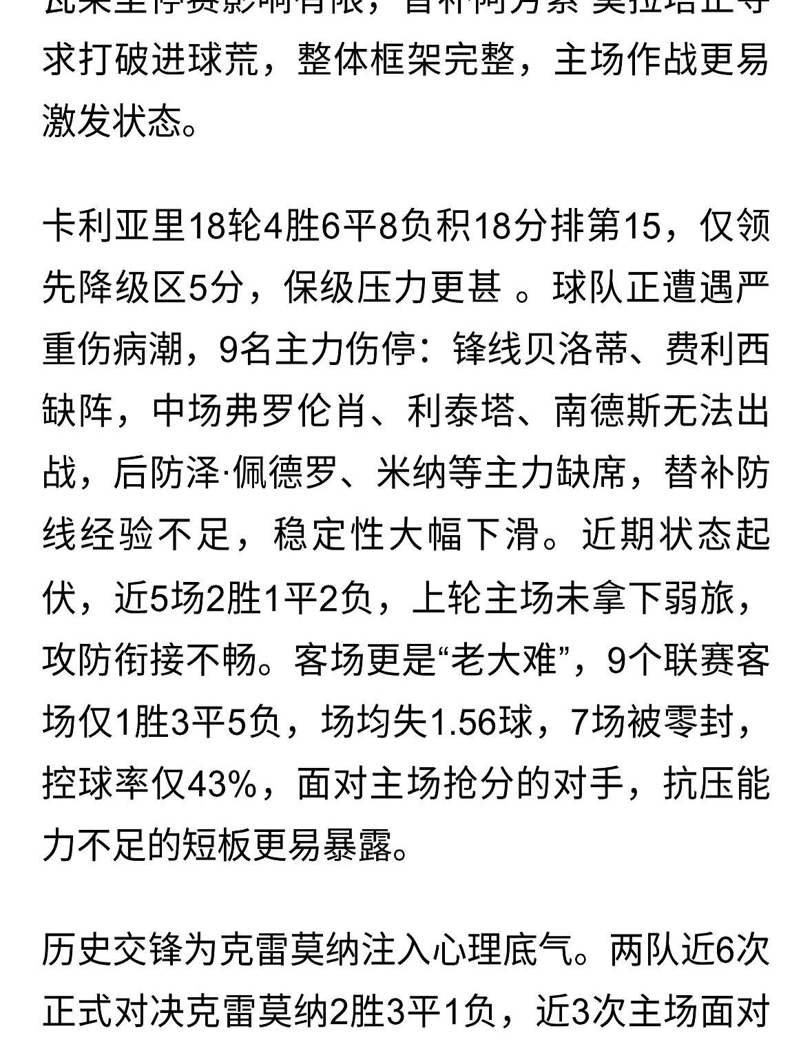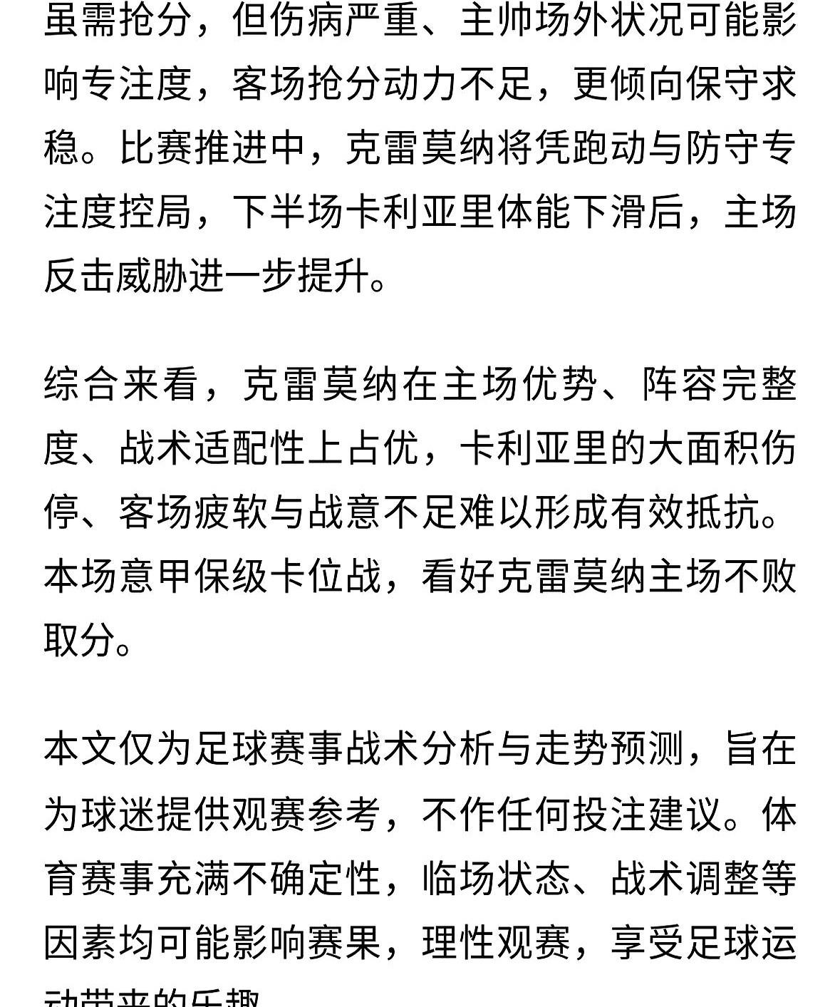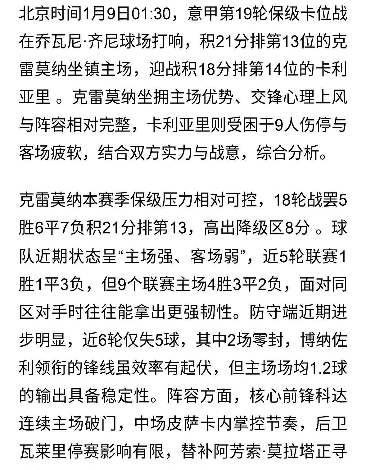 意甲保级“6分战”来了!22分打19分,谁输谁就危险了。 明天凌晨这场球,真的是刺刀见红。 主队克雷莫内塞,刚升上来的,现在排第13,主场表现特别稳,防守那叫一个硬。 卡利亚里呢?第14名,客场虫属性拉满,进攻便秘,经常被对手零封。 这俩队积分就差3分,赢家直接喘大口气,输家……那就离降级区不远了! 别看卡利亚里最近交手占点便宜,但在克雷莫内塞的地盘上,他们可一次都没赢过。 我猜一个1-0,主队拿下!你们觉得呢?