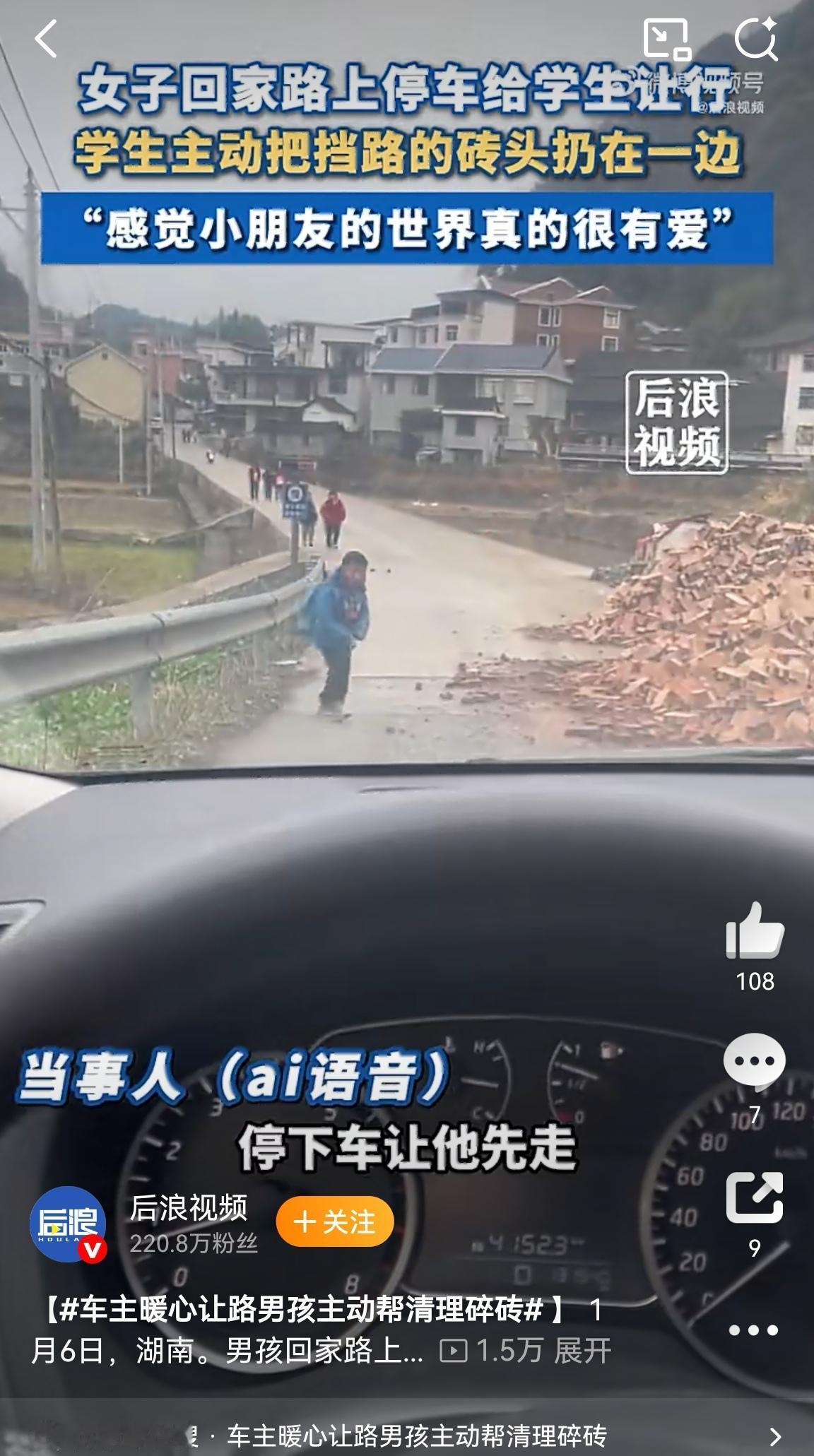 一百年过去了,在我们这个国家的学生,助人为乐的传承依然深入骨髓。 1月6号湖南女子开车回家,当经过一段有堆砖块的道路时,看到迎面走来几个放学的小学生。 因为砖块侵占了路面,女子主动把车停下,想让孩子们先过去,然后自己再想办法。 走在前面的男孩走到那片碎砖时,突然弯腰主动清理起堵在路上的碎砖。后面跟上的小朋友也纷纷帮忙。 女子把这段感人的视频发到网上,无限感慨现在我们的小朋友真的很棒。 社会感动故事