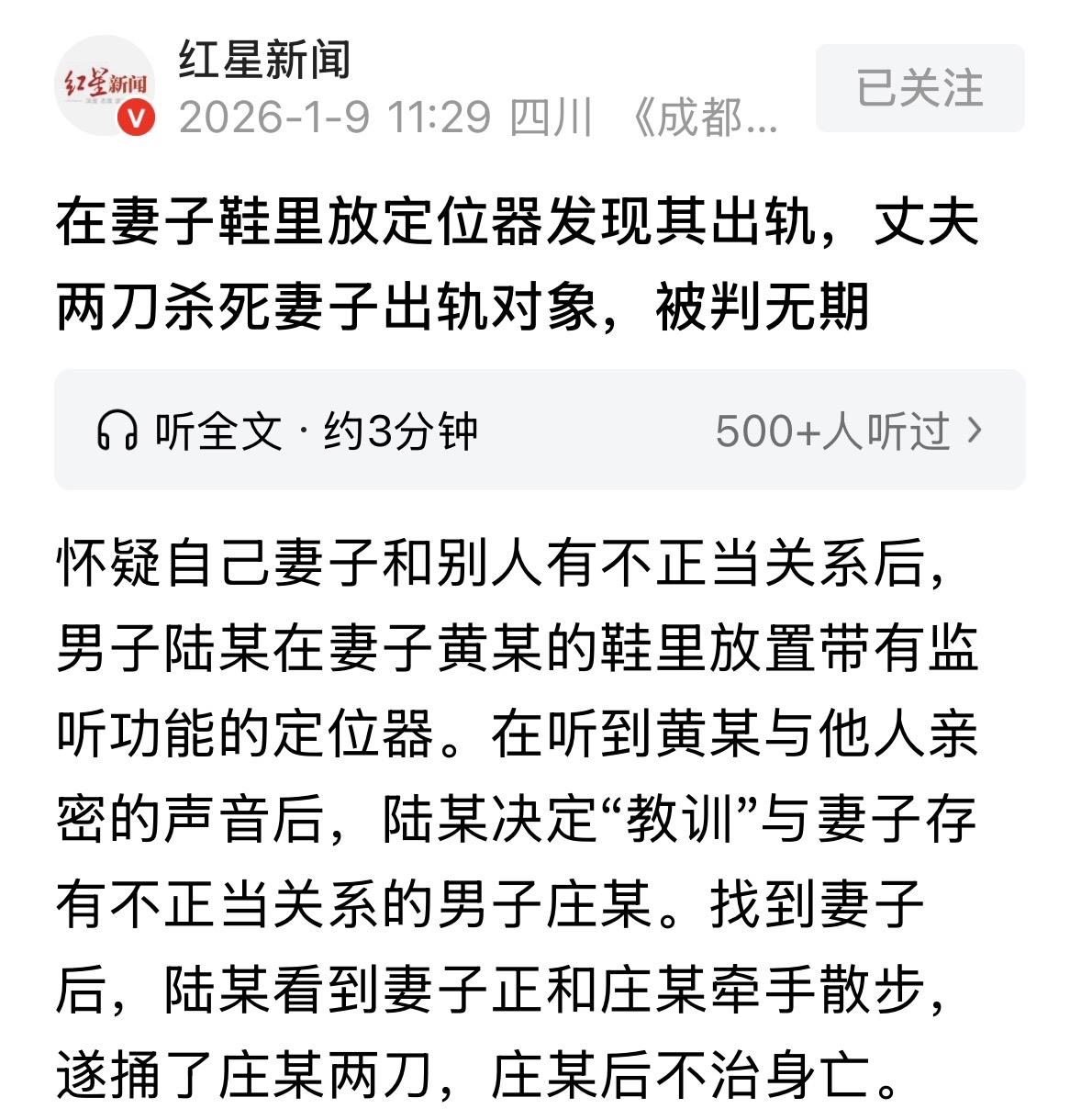 广东深圳,男子怀疑妻子给他戴绿帽,为了拿到证据,他往妻子鞋里放了一个带录音的定位器,果然发现妻子与一男人亲密接触,他不吵不闹,带着一把刀,寻着定位找去,正好碰见妻子和那男人牵手散步,他二话不说,持刀冲上去给了那男人两刀,最终对方失血过多身亡。一审时,法院以故意伤害罪判男子无期徒刑,他不服,提起上诉,二审法院这样判了。 陆某有一阵总觉得老婆黄某不对劲,那状态,像是出轨了。 为了抓把柄,他也是费尽心机,竟然偷偷在老婆鞋里塞了个带录音功能的定位器。 这样一来,他就随时掌握妻子的行踪。 这天,陆某通过定位器的录音,听到妻子和另一个男人有亲密动静。 作为一个男人,陆某当时就崩了,觉得尊严被踩在脚底下摩擦,脑子里只剩下一个念头:得给这对男女一点颜色看看! 2024年6月16号这天,陆某通过定位确认了老婆和庄某的位置。 他没吵没闹,而是冷静地找了一把剔骨刀。这可是真家伙,锋利得很。 他把刀藏在电动车后备箱里,然后骑着车一路追到了目的地。 下午6点,他到达地方,眼前的一幕彻底刺痛了陆某。 黄某和庄某正手牵手在路边溜达,那叫一个亲密。陆某的血瞬间涌上头顶,他停好车,从后备箱抽出刀,像疯了一样冲上去。 陆某趁着庄某没防备,对着他的后背就是狠狠一刀。 庄某吃痛刚想转身看是谁,陆某把刀抽出来,迎面又是一刀,直接扎在了身上。 这两刀太狠了,庄某当场倒地不起,血流如注。 陆某看着倒在地上的庄某,没跑也没躲,而是当场掏出手机报了警,然后留在原地等着警察来抓他。 最后,庄某因为伤势太重,左肺、胸主动脉、胃、右肾和肠子都被扎破了,大出血死亡。 案子到了法院,法官审理认为,陆某虽然是故意伤害,不是预谋已久的故意杀人,但拿着剔骨刀往要害扎,这就是奔着要命去的。 不过,考虑到陆某杀了人没跑,主动报警等着被抓,这算自首。 再加上庄某和人家老婆搞婚外情,对引发这事儿有明显过错,属于咎由自取。 所以,一审法院判了陆某无期徒刑。 但陆某不服,觉得判太重了,提出了上诉。他的理由无非是:是对方先绿了我,我也自首了,家里也愿意赔钱,能不能再轻点? 二审打到高院,这次会怎么判? 《刑法》第234条规定:故意伤害他人身体的,处三年以下有期徒刑、拘役或者管制。致人死亡或者以特别残忍手段致人重伤造成严重残疾的,处十年以上有期徒刑、无期徒刑或者死刑。 陆某在供述中一直强调自己只是想教训一下庄某,而不是想杀他。 但在法律看来,主观意图不是靠嘴说,而是看行为。 陆某使用刀具捅刺人体要害部位,且连续捅刺两次,这种行为在法律上被直接评价为“以特别残忍手段致人死亡”或“故意伤害致死”。 哪怕陆某心里想的是给个教训,但他选择了剔骨刀这种致命凶器,攻击了致命部位,就必须承担致人死亡的法律后果。 这一条直接把案件的性质锁死在了“十年以上、无期、死刑”这个量刑档里,没有回旋余地。 可以说这个案子,起步就是重刑。但一审和二审都判了无期徒刑,关键在于叠加从轻情节的运用。 被害人庄某与有夫之妇长期保持不正当关系,且在案发当天手牵手刺激被告人,对矛盾激化负有明显责任。 陆某杀人后没有逃跑,而是留在现场报警并等待抓捕。根据法律规定,自首可以从轻或减轻处罚。 虽然陆某想赔,但家属拒绝,没拿到谅解书,所以不能享受积极赔偿带来的大幅度从轻。 这次法官审理认为:第一,你拿着剔骨刀连捅两下,一刀后背一刀前胸,这不是教训,这就是想弄死人或者至少想造成重伤,伤害的故意非常明显。 第二,虽然对方有错、你也自首了,但一审判决已经因为这两点给你从轻发落了,判无期已经是底线了,你还想怎么减? 第三,你家想赔钱,但被害人家属恨透了你,给钱也不要,这谅解书拿不到,法律上就不能再给你减刑。 所以,二审结果很干脆:驳回上诉,维持原判。无期徒刑这就算板上钉钉了。 陆某确实惨,被戴了绿帽子,这种屈辱一般人受不了。但他处理问题的方式太极端,也太愚蠢。 你说你为了个背叛你的女人,把自己搭进监狱坐一辈子牢,值当吗?庄某虽然该死,但法律没赋予陆某剥夺他生命的权利。 婚姻里过不下去就离,千万别动杀心。奸情虽然不对,但杀人可是要偿命或者把牢底坐穿的。 一念之差从受害者变成了伤害者,一生的命运就此改变!都说冲动是魔鬼,既然出轨己成事实,婚姻的去留,主动权在你手里,又何必以身试法呢? 为这样的女人没有必要去犯罪,既然她出轨,留着证据,起诉离婚,她一分钱财产得不到,不更好吗? 对此,你怎么看? 关注@运良说法