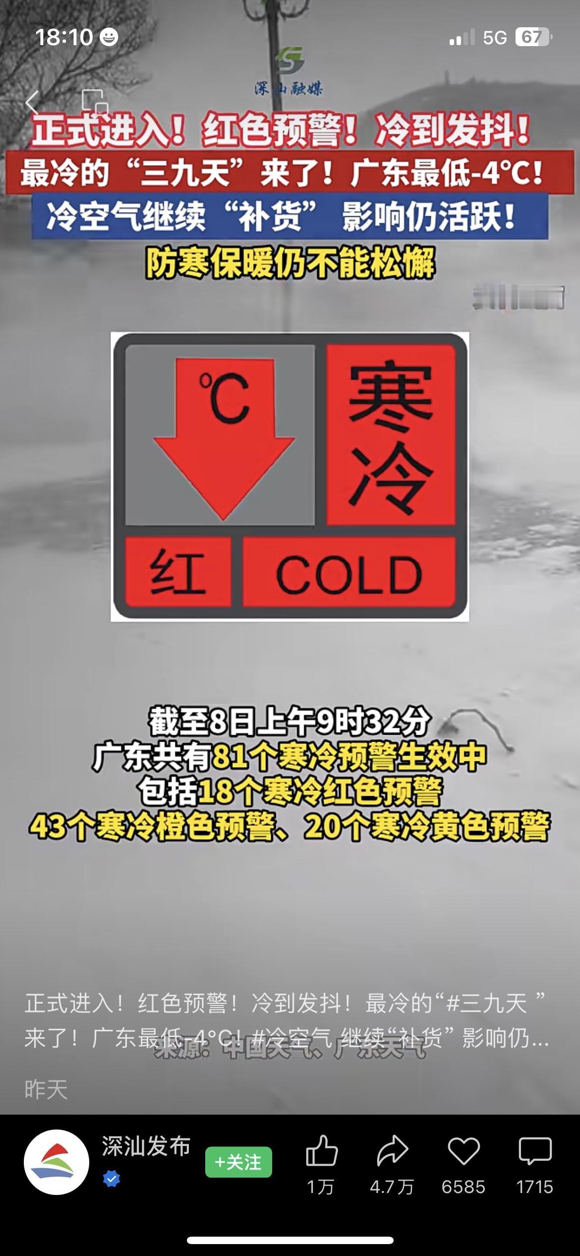 🔥广东三九天速冻!粤北跌破-4℃,81个寒冷预警拉响,18个红色预警! 前几天还穿短袖喝凉茶的广东人,今天集体翻箱倒柜找羽绒服!没暖气的南方娃,冻得裹着被子缩沙发,取暖器直接卖断货,超市暖宝宝被抢空😂 北方朋友别笑!广东的-4℃湿冷,是魔法攻击,比北方干冷刺骨多了!粤北的果树蔬菜都盖了“防寒被”,生鲜价格怕是要悄悄涨一波~ 更扎心的是,冷空气还在补货!10日刚回暖,11日又要降温! 👉广东的街坊,你家现在多少度?靠空调暖气还是一身正气过冬?评论区晒出来! 广东寒潮 三九天 南方过冬有多难 广东冬日气候