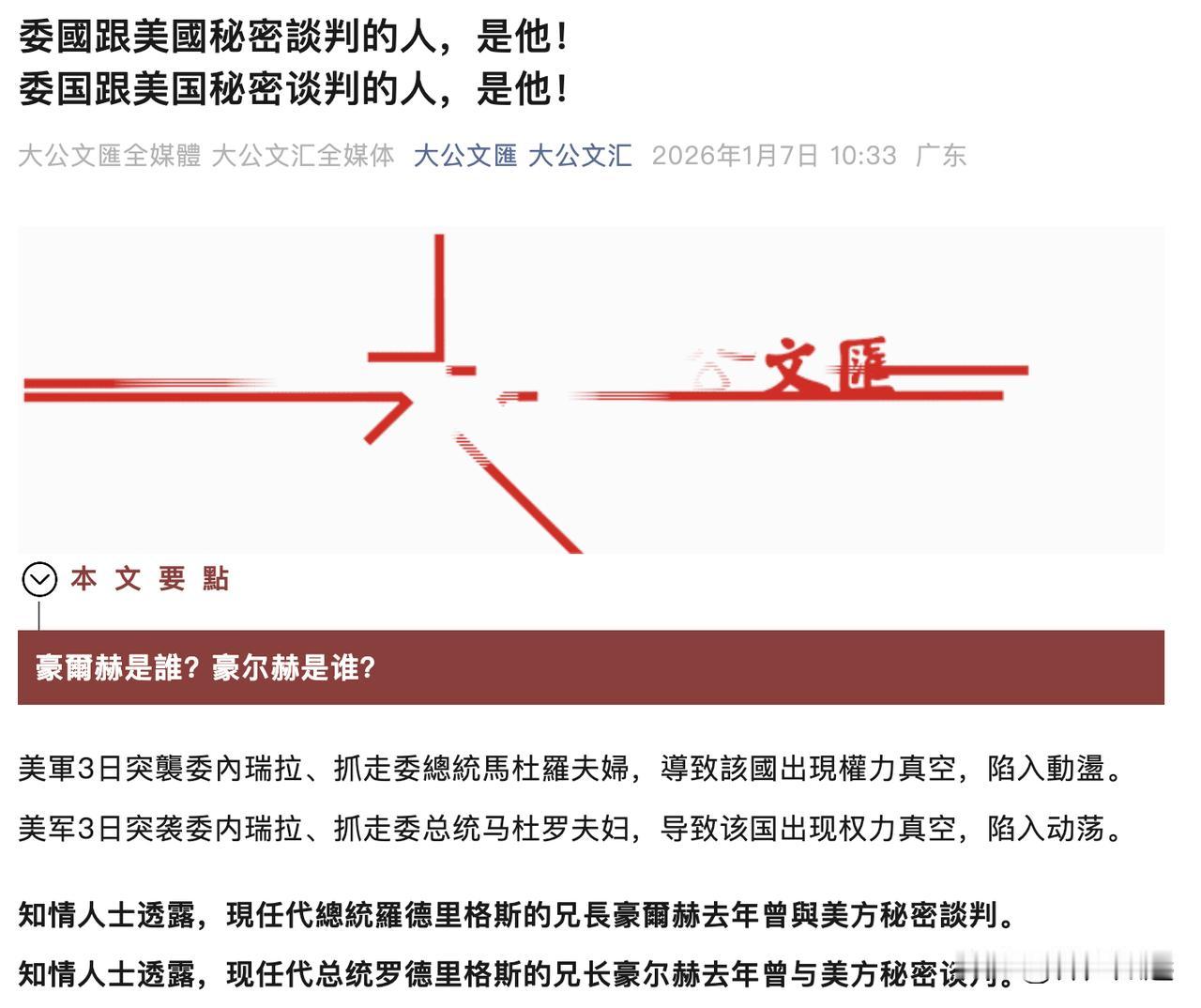 果然委内瑞拉“交易”“成交了”!特朗普称取消对委第二波军事打击。 1月9日,特朗普在社交媒体发帖称: 委内瑞拉正释放大批政治犯,以此作为"寻求和平"的象征。这是一项非常重要且明智的举措。美国与委内瑞拉正通力合作,尤其是在涉及以规模更大,更完善,更现代化的方式重建双方的油气基础设施方面。由于这种合作的存在,我已取消了原先预定的第二波攻击行动。目前来看,似乎已不再有必要采取此类行动。不过,所有船只仍将停留在原位,以确保安全与稳定。大型石油企业预计将投入至少1000亿美元的资金,我今日将在白宫与所有这些企业代表会面。 这果然是场“交易”,只是白白牺牲了50人的性命,马杜罗和妻子沦为阶下囚,国际规则沦为废纸。 之前英国《金融时报》就曾报道过:委内瑞拉代总统的哥哥豪尔赫去年曾与美方秘密谈判, 核心内容是让罗德里格斯领导过渡政府,马杜罗则 “安全流亡第三国”。 目前看来交易已经达成,所以不需要第二波动作了。