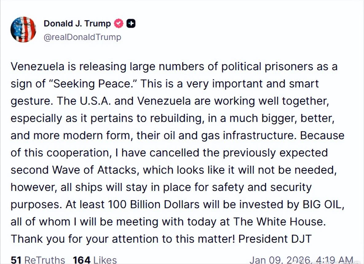 果然委内瑞拉“交易”“成交了”!特朗普称取消对委第二波军事打击。 1月9日,特