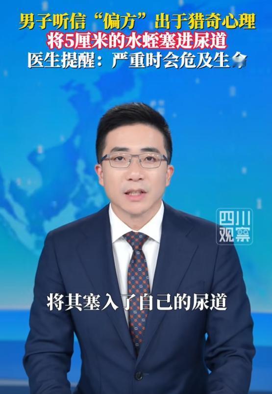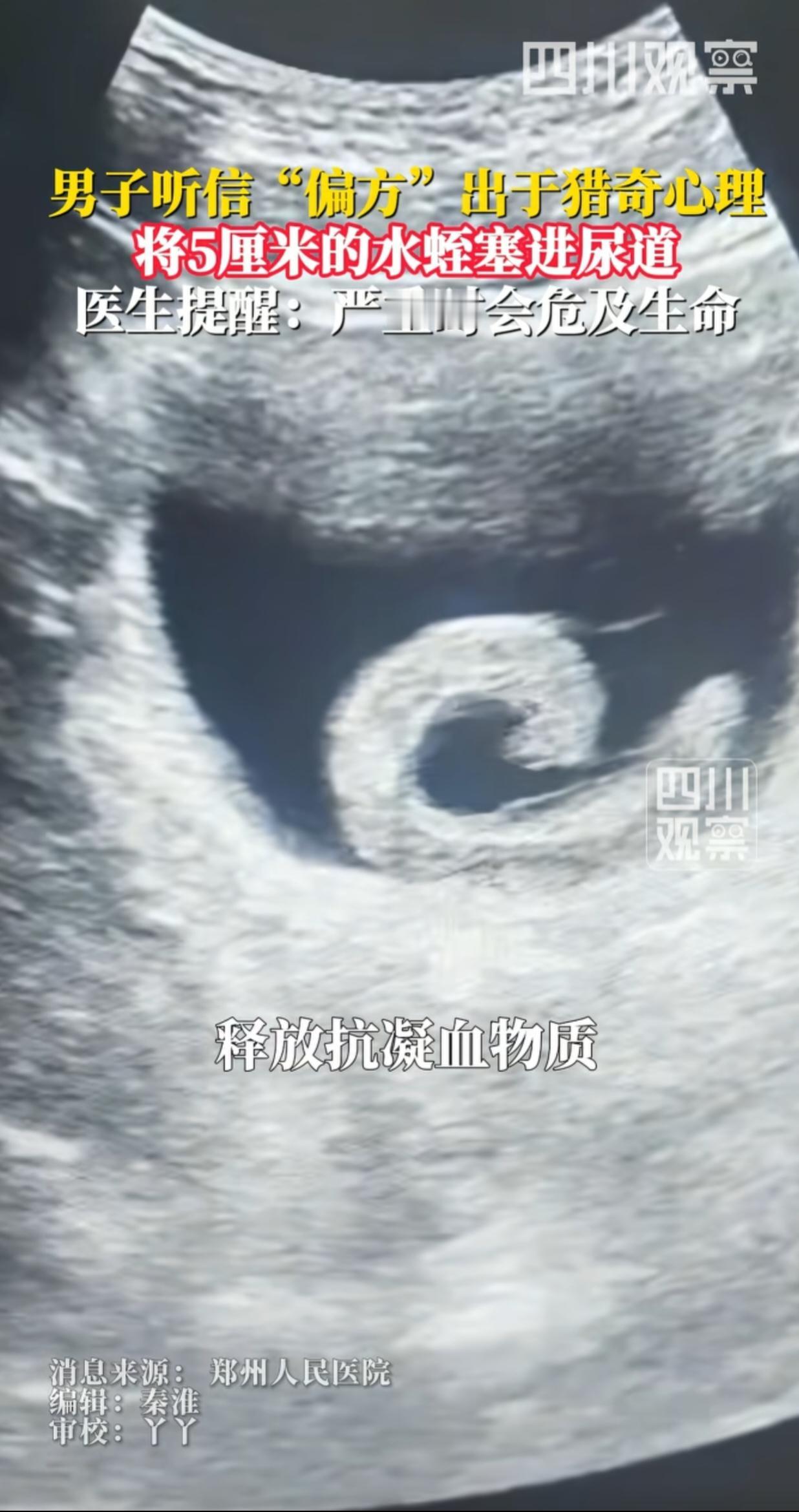 男子把活水蛭塞入尿道钻进膀胱,听着都害怕,不知他亲身经历是怎样的一个过程,水蛭在膀胱里疯狂吸血,要不是进医院恐怕没命了。据说他是听信偏方,这是什么偏方?能治什么病?又好笑又无知啊!水蛭就是蚂蟥,是真正的吸血鬼,好多人可能都没见识过它的厉害。
