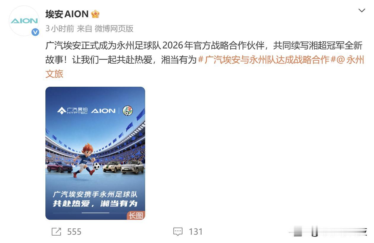 广汽埃安正式官宣成为湘超冠军永州队的赞助商,以一系列实打实的福利为球队和球迷送上惊喜。球队方面,将通过全民票选产生“永州队2025年最佳阵容”,入选的11名球员、最佳进球球员及主教练每人将获赠一台埃安UT super;球迷福利更是贯穿全年——在1月18日至24日的CMG群众足球邀请赛期间,线上抽奖送出一台埃安UT super,现场观众也有机会赢取埃安i60增程版。 更令人期待的是,2026年湘超联赛四个月赛程中,永州赛区每月都将抽取一位幸运球迷,赠送一台埃安i60增程版,让惊喜持续传递。为纪念这一合作,双方还特别推出“永冲锋”冠军纪念版定制车型,将竞技荣耀融入产品设计。埃安UT super作为可充可换电的国民好车,适配多元出行场景;埃安i60增程版则凭借亏电低油耗、强动力的表现,为家庭用户带来“零焦虑”的出行体验。 广汽埃安与永州队达成战略合作 永州夺冠