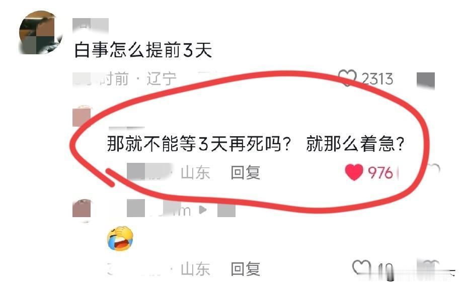 辽宁省办宴席需要提前3天报备,网友的评论能笑喷人 今天媒体发布的一条消息说,辽宁省出台规定,农村集体宴席,100个人以上,需要提前3天向当地乡镇(街道)市监部门报备,报告聚餐时间,地点,人物,菜谱等,并且要留菜样。 这个新闻本身不好笑,估计当地出台这个政策也是为了食品安全考虑,防患于未然,也是可以理解的。 就是网友们的评论特别搞笑,其中一个辽宁网友问:白事怎么提前?(白事怎么提前3天报备),一个山东网友回复:那就不能等3天再死?就那么着急? 只能说网友们个个都是人才,社会新闻而已,被他们的评论说的像相声段子一样[捂脸][呲牙]酒席标准 农村习俗宴席 家乡宴席服务 宴席避坑 宴席有政策 喜宴政策