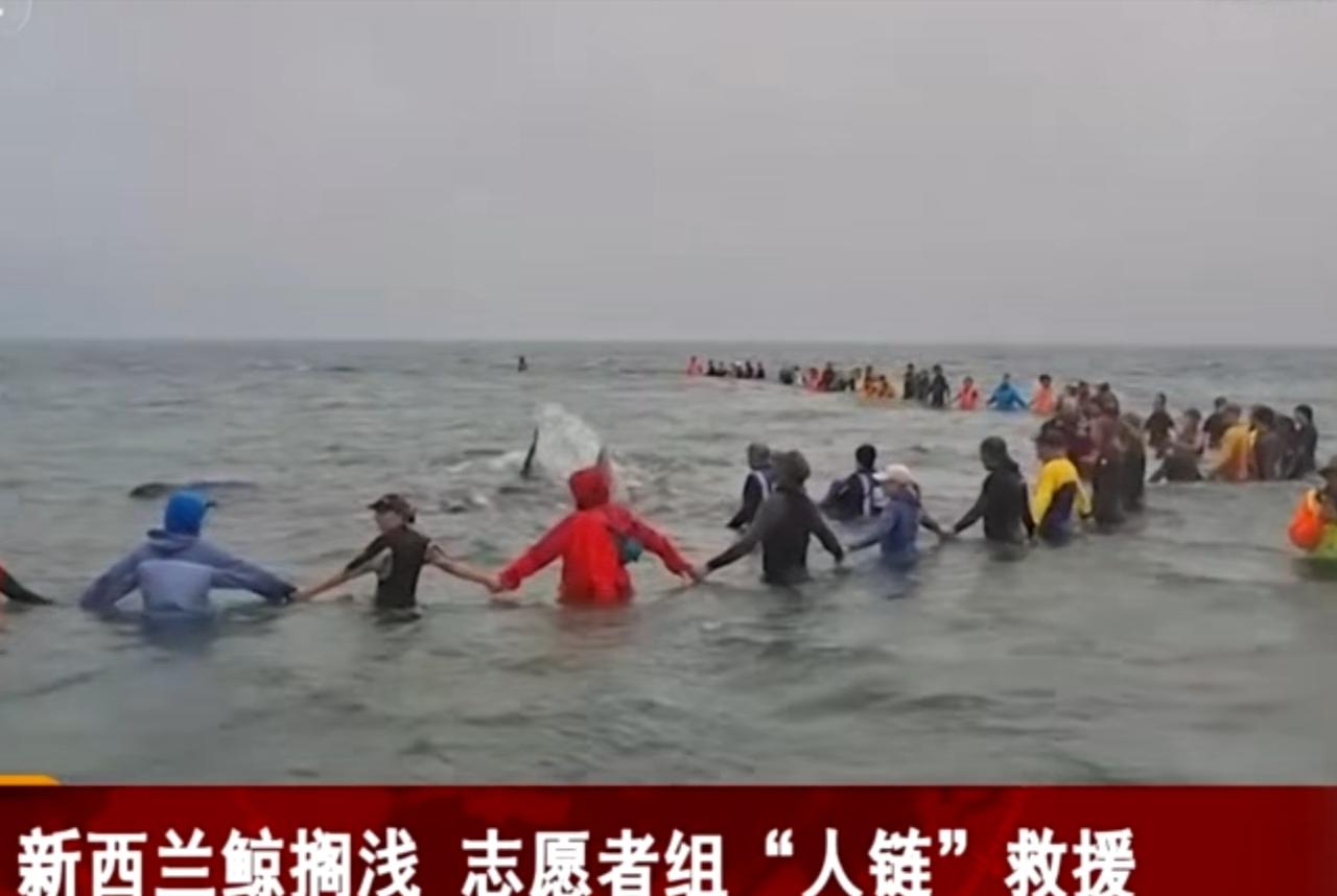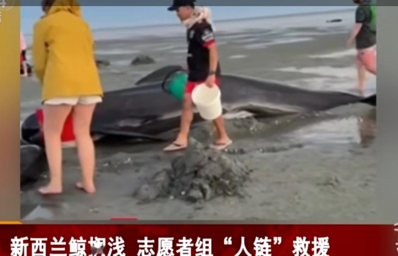 新西兰海滩上演暖心救援一幕,数头鲸鱼搁浅在滩涂之上,黝黑的身躯暴露在浅滩中,情况危急。志愿者们迅速行动起来,有人提着水桶不断往鲸鱼身上浇海水,为其保持身体湿润,还有大批志愿者走进海水中,手拉手组成长长的“人链”,试图引导鲸鱼重返深海。画面里,不同衣着的志愿者齐心协力,用行动守护着这些海洋生灵,尽显人与自然之间的温情与善意。