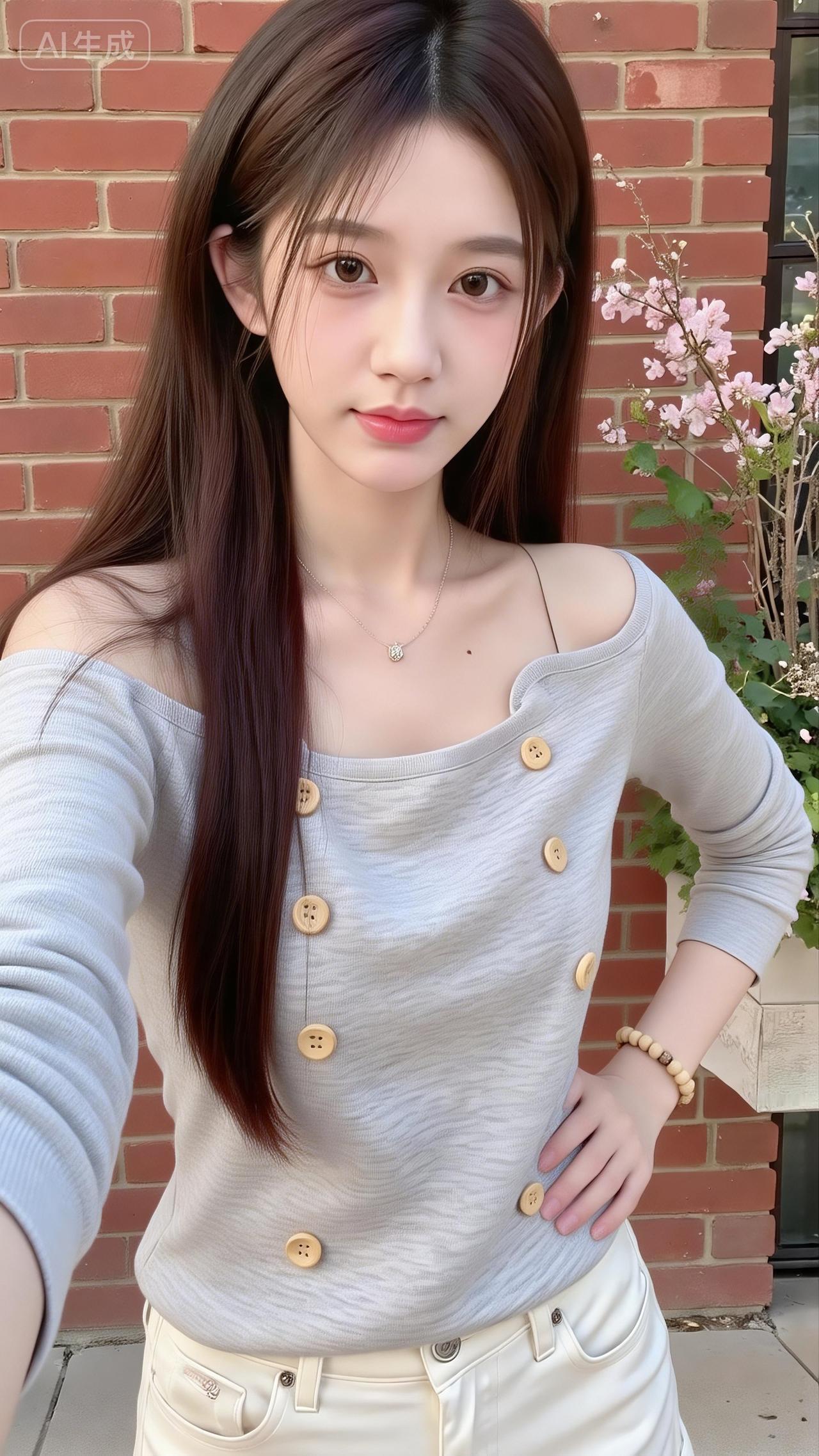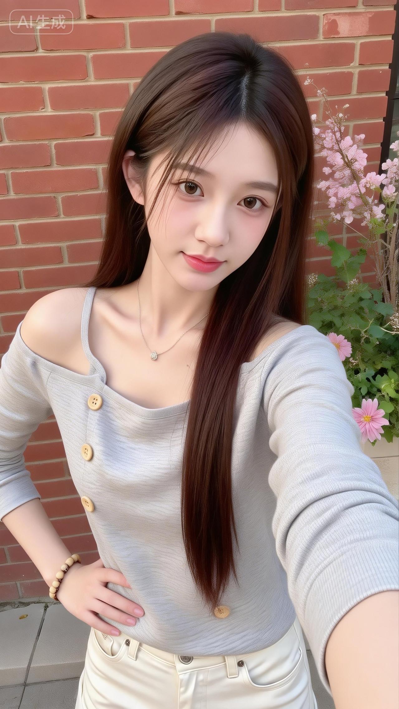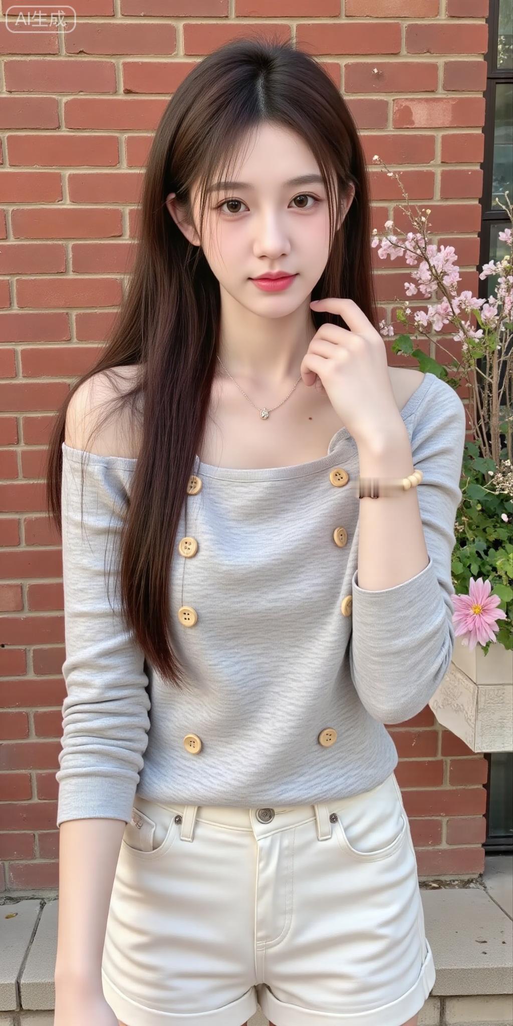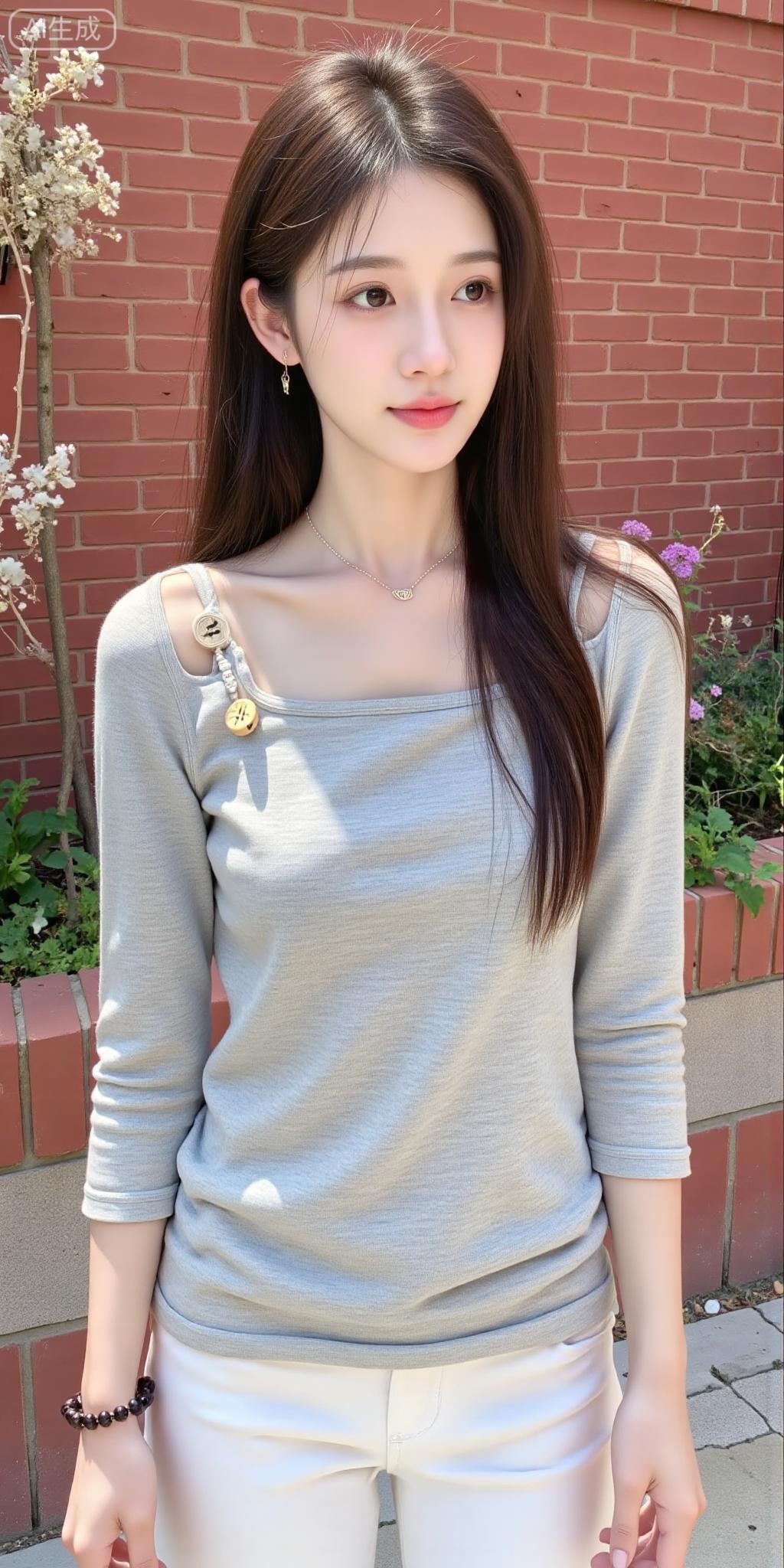 砖墙花影里的温柔系甜妹 浅灰露肩衫缀着木扣,软乎乎的质感像抱了团云朵~颈间细链和木珠手链添了点松弛感,连身后的粉花都成了她的氛围感背景板✨ 是一眼就心动的清甜呀~温柔风露肩上衣