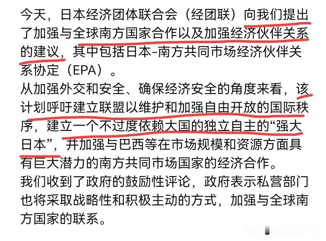 高市早苗出来亮明态度了!在我们反制之后,高市早苗本人进行了一番回应!1月9日,高市早苗发表声明声称,今日,我们收到了日本经济团体联合会的提议,内容聚焦于加强与全球南方国家的合作,以及推进包括日-南方共同市场经济伙伴关系协定在内的经济协作。 该提议指出,需从强化外交与安全保障、维护经济安全的角度出发,为维护和巩固自由开放的国际秩序拓展合作伙伴,打造不过度依赖大国、具备自立能力的“强大日本”,尤其要基于市场规模、资源禀赋等优势,加强与巴西等潜力巨大的南方共同市场国家的经济协作。 很自然,高市早苗虽然没有点名中国,也没有表明自身对相关建议的立场,但是从日本经济团体联合会给高市早苗的提议来看,日本的一个动向还是非常清晰的。那就是日本要所谓的打造不过度依赖大国、具备自立能力的“强大日本”。这说明什么呢?这说明面对我们的施压,高市早苗的态度是她本人知悉,但选择沉默以对,而把不过度依赖当成是日本未来的重点。 事实上,就在高市早苗发表这一立场之前,日本外务大臣茂木敏充公开表示,日本将与七国集团等各方合作。因此,高市早苗的立场已经不难猜测,那就是她本人不会撤回恶劣言论,而是要推进日本关键物项的独立自主,并把这当成是一个更强大日本的基础。很显然,高市早苗不会回头!