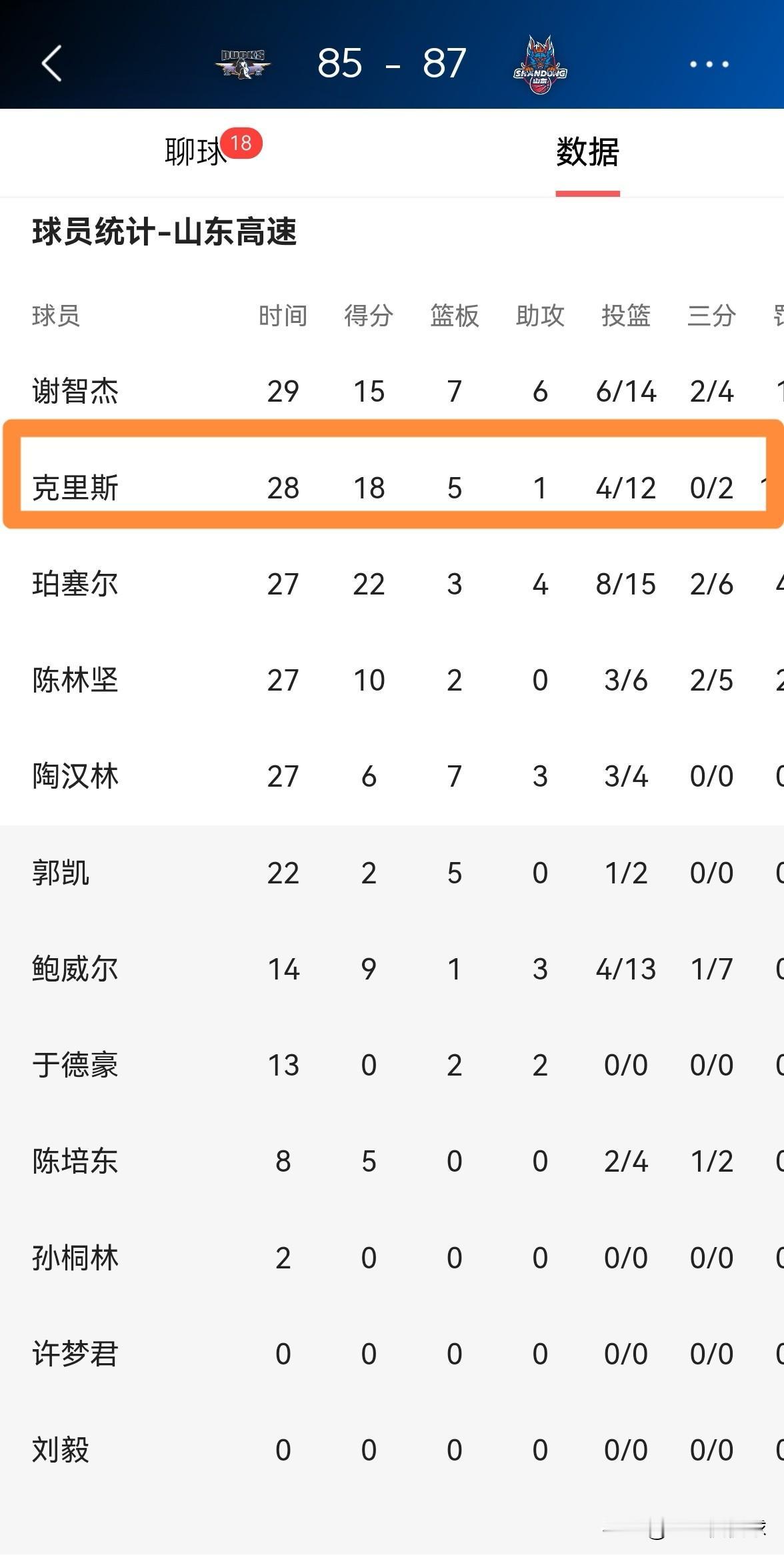 山东高速外援克里斯真是太有冲击力了!在今天山东高速客场以87:85险胜北京北汽的比赛中,克里斯疯狂的冲击篮下,将北京北汽的内线冲击的七零八落,最终博得了11次罚球,由此可见克里斯的冲击力是多么的强。 全场比赛下来,克里斯首发出战28分钟,投篮12中4,其中三分球2中0、罚球11中10得到18分5篮板。