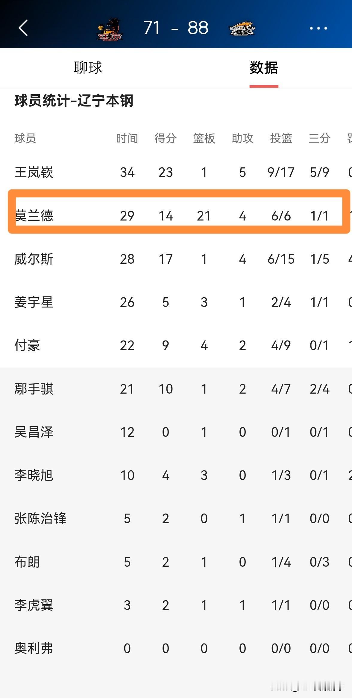 辽宁本钢老将莫兰德真是一头篮板怪兽!在今天辽宁本钢客场以88:71击败江苏肯帝亚的比赛中,莫兰德疯狂的拼抢到了21个篮板,其中包括6个前场篮板。 整场比赛下来,莫兰德首发出战29分钟,投篮6中6,其中三分球1中1、罚球2中1得到14分21篮板4助攻1抢断3盖帽,他的场上正负值为+25。 如果莫兰德能够在接下来的比赛中延续这样的篮板球表现,那么辽宁本钢必将继续连胜。