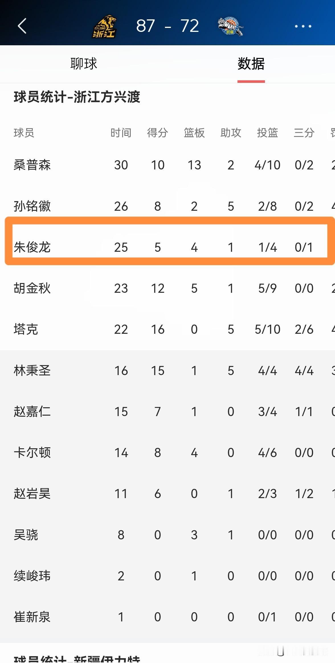 浙江方兴渡大将朱俊龙真是手感冰凉!在今天浙江方兴渡主场以87:72击败新疆伊犁特的比赛中,朱俊龙首发出战25分钟,投篮4中1,其中三分球1中0、罚球4中3非常低效的得到5分,不过有4篮板1助攻,他的场上正负值为+11。 希望朱俊龙能够不断的增强自己的投射能力,因为这不仅关系到浙江方兴渡能否实现卫冕,而且关系到中国男篮的成绩。