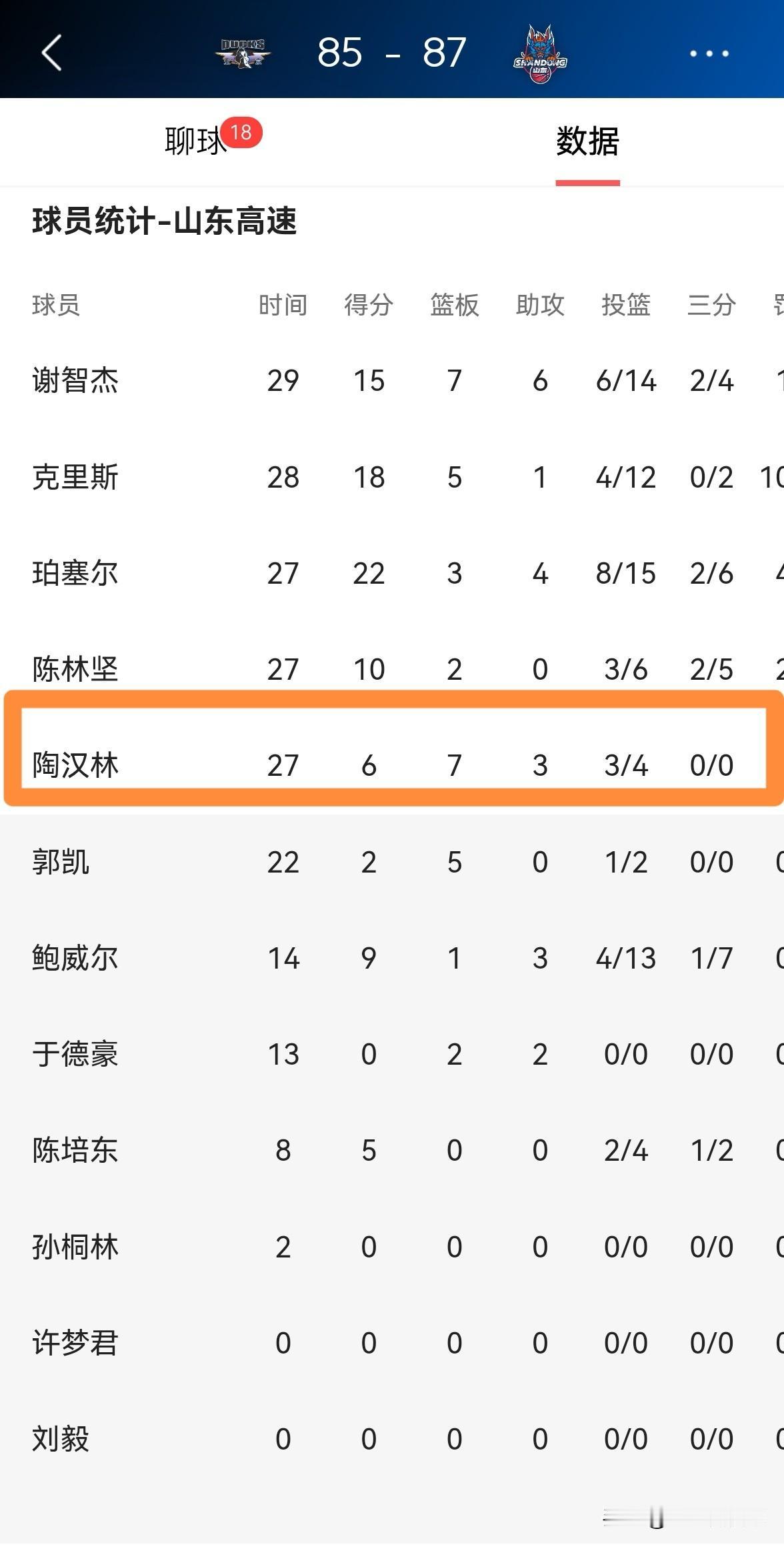 山东高速老将陶汉林真是太拼了!在今天山东高速客场以87:85险胜北京北汽的比赛中陶汉林在攻防两端都拼尽全力,最终五犯离场。 全场比赛下来,陶汉林首发出战27分钟,投篮4中3得到6分7篮板3助攻,可惜的是在比赛的关键时刻陶汉林五犯离场。 我真的要为陶汉林的拼搏精神点赞,只要他在场上,他就会付出自己的全部。