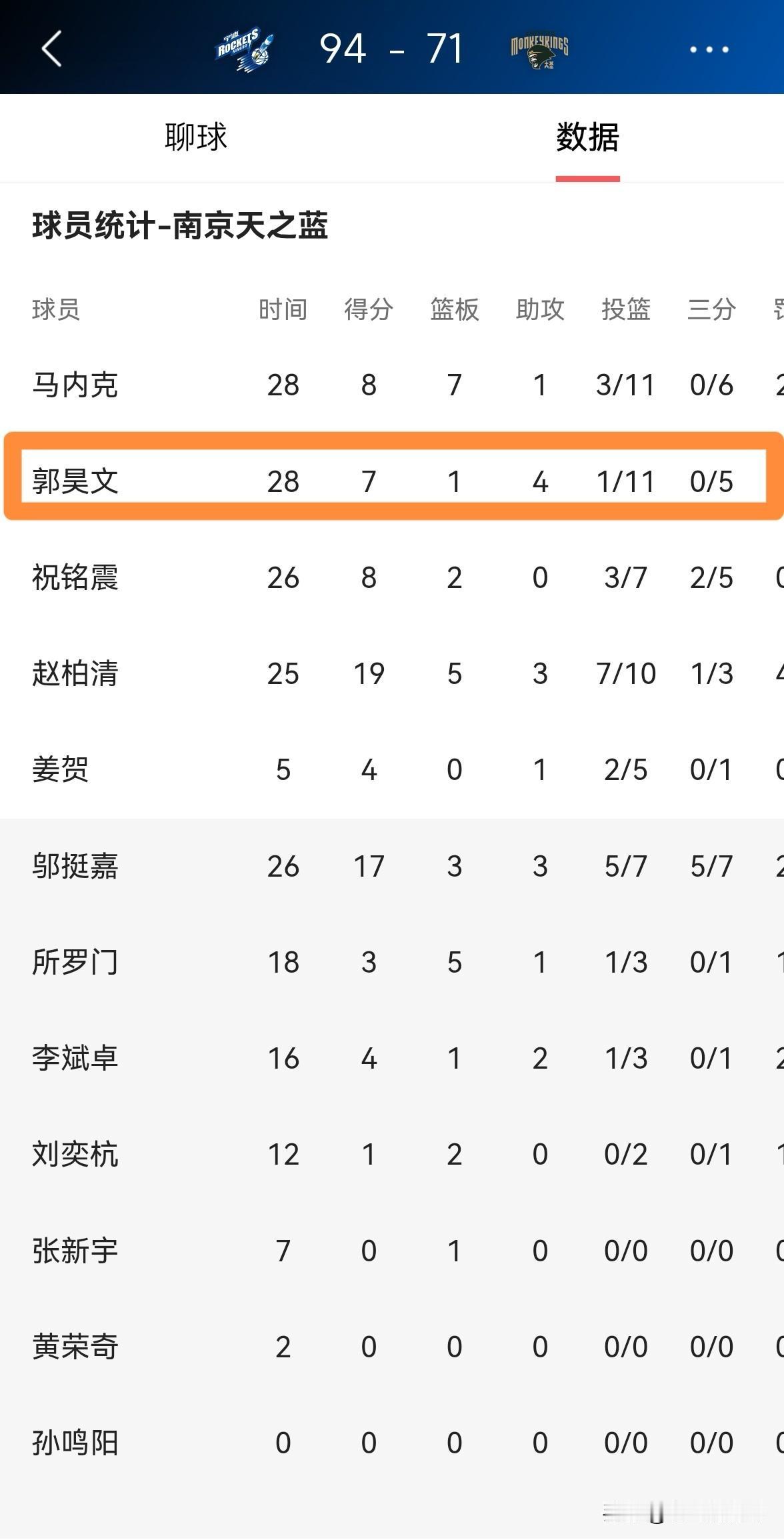 南京天之蓝当家球星郭昊文真是极其拉胯!在今天南京天之蓝客场以71:94惨败于宁波町渥的比赛中,郭昊文的表现简直就是一场灾难,他必须为球队的惨败背锅。 全场比赛下来,郭昊文首发出战28分钟,投篮11中1,其中三分球5中0、罚球9中5极其低效的得到7分,还出现了多达6次的失误。