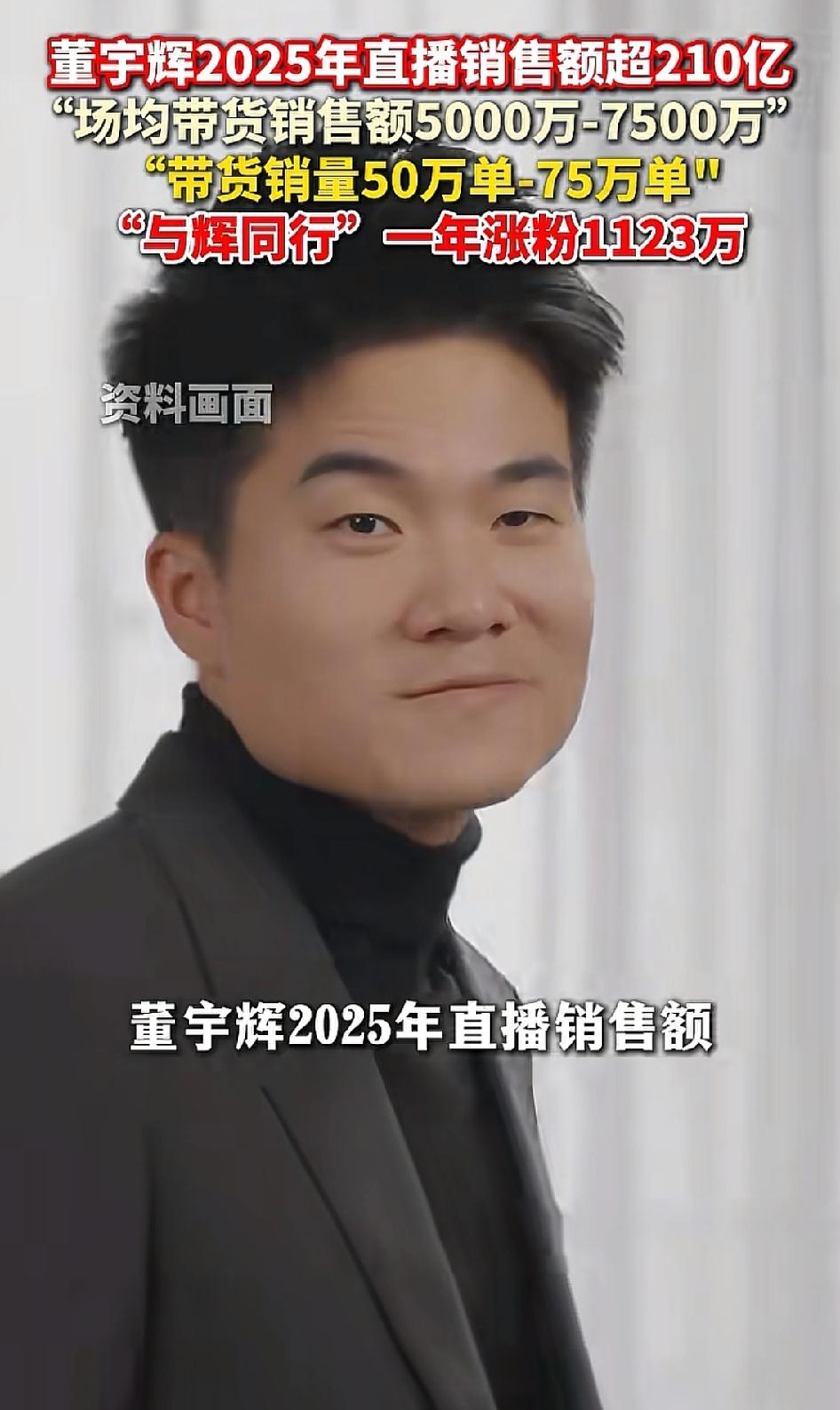 这下瞒不住了, 董宇辉真的是彻底出圈了。 不仅俞敏洪,全国都知道了。与辉同行一年的销售额破210亿,销量超2.1亿单。与辉同行2025年涨粉1,123万。 这个数据,有哪一项不是超出了你的预料的? 董宇辉一个白面书生站上销售台,居然成了全国的销冠。 他一个人210亿的年销售额,背后是无数的农民、工厂、生产加工商,物流人员、售后服务人员的生活。虽然我们看不到这背后的一切,但不可否认,董宇辉线下养活了无数人无数个家庭。 这个单飞成绩,你说还有谁会不服吗?