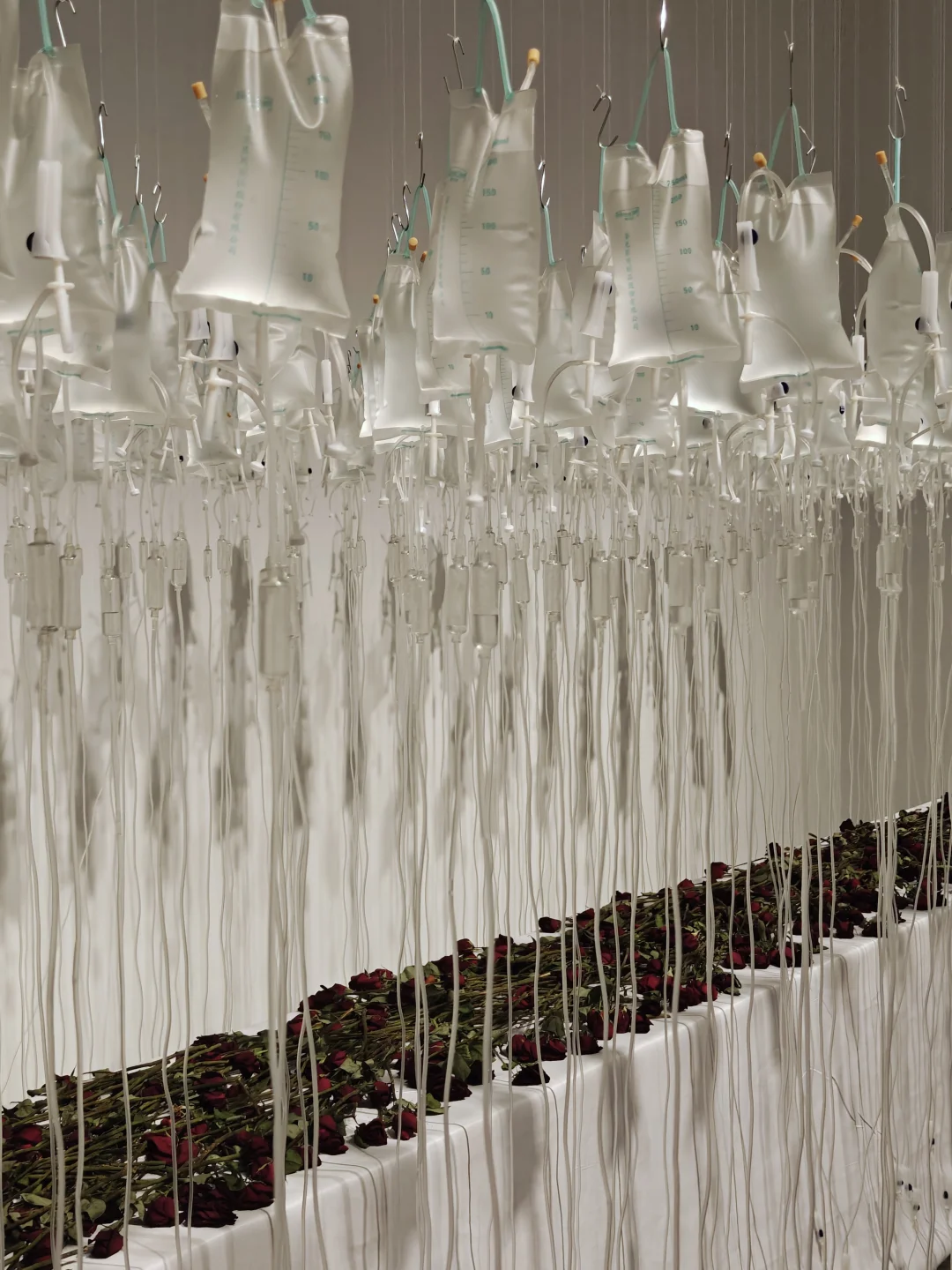 陈妍音2000年上海双年展代表作《一念之间的差异》,玫瑰花配倒悬输液瓶,探讨生命、情感与工业化医疗的关联;