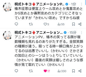 椿木征思虽然为了方便被归类为冷酷攻、鬼畜攻、S攻、寡言攻这些类别,但他其实是“可爱攻”呢。动画PV里能看到好几种椿木的笑脸真是太棒了。每种笑容都不一样。打人的时候嘴角微微上扬的样子既凶狠又很棒(可爱);和倒过来的加白在一起的场景显得很陶醉也很棒(可爱);最后的笑容能看出喜悦之类的 ...全文
