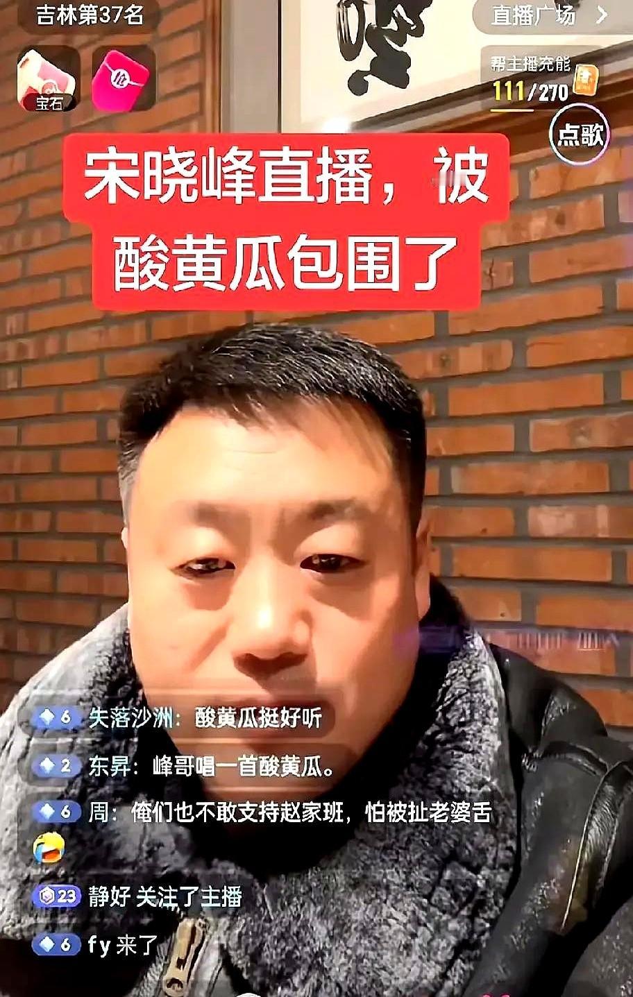 赵家班集体懵了,直播间被“酸黄瓜”三个字刷爆了! 宋晓峰正宣传新歌《我的东北老家》,两万多人眼睁睁看他被刷到提前下播,全程一脸问号。 另一边,“赵四”刘小光脸都黑了,严肃要求别闹……结果被网友截成表情包满天飞。 二柱子更直接,干脆战术性撤退。 其实这梗跟他们没啥关系,纯属是网友的“团建”误伤。 没想到几天后,宋晓峰再开播,五万人涌进来继续刷!他直接自嘲:没这仨字都不完整了。 老艺术家从慌乱到主动接梗,这波流量算是让他俩吃明白了。
