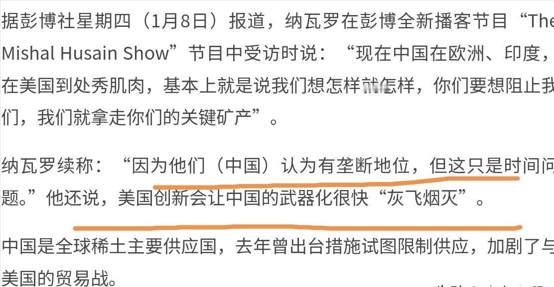 美国把底牌露出来了! 1月9日,特朗普首席贸易顾问纳瓦罗的一番话,直接把美国对华贸易的底牌摊在了台面上。他直言不讳地指责中国凭借所谓“垄断地位”,在欧洲、印度和美国到处“秀肌肉”,还妄称中国的这种“武器化”操作,迟早会被美国的创新彻底瓦解。这话听着强硬,却藏着明显的底气不足,因为他紧接着就透露了美国当下的真实打法——搞外交,要是有人觉得这是软弱,那就是不懂他们的棋局。 纳瓦罗口中的“武器化”,实则是把中国合法的资源管控和产业优势刻意歪曲。他特别点出稀土领域,宣称要靠美国工业突破终结中国的主导地位。 要知道,中国在稀土和永磁体精炼领域占据全球90%以上的产能,这是数十年产业积累的市场结果,而非所谓“垄断”。但美国确实没闲着,一边喊着创新破局,一边已经在全球布局小动作。 去年12月,美国刚和日韩、新加坡、荷兰等国官员密集会晤,把关键矿产、半导体、人工智能等领域绑在一起搞联盟,甚至盯上了委内瑞拉的稀土资源,试图在供应链上摆脱对中国的依赖。 所谓的外交布局,更像是一场精准的施压行动。纳瓦罗明确敦促欧洲必须采取和美国完全相同的关税水平,理由听起来很直白:美国加征关税后,中国商品在美国卖不动,必然会“倾销”到欧洲和墨西哥。 这套说辞看似站在欧洲立场,实则藏着美国的私心——一旦欧洲不跟进,中国商品大量涌入欧洲市场,美国本土产业在国际竞争中只会更被动。可美国的如意算盘,未必能敲得响。 早在去年9月,欧盟外交与安全政策高级代表博雷利就公开表态,欧洲不会跟随美国对华征收关税,贸易战必须避免,中欧经贸关系的互利共赢本质,不是美国一句话就能改写的。 更有意思的是墨西哥的态度,这让美国的预判多了一层变数。就在2026年年初,墨西哥刚对包括中国在内的非自贸协定国家加征35%关税,看似和美国的诉求呼应,实则有自己的考量。 美墨贸易去年创下近9000亿美元的纪录,墨西哥对美贸易顺差高达1700多亿美元,它的关税调整更多是为了平衡自身贸易结构,而非单纯配合美国。 这意味着中国商品即便受美国关税影响,流向也未必完全如纳瓦罗所料,美国想靠盟友围堵的想法,从一开始就存在漏洞。 纳瓦罗的言论,本质上是挑明了中美贸易战休兵的真相——这从来不是妥协,而是美国的缓兵之计。2025年底中美贸易战按下“暂停键”,美国还延长了178项中国商品的关税豁免,甚至调低了200多种食品的关税,这些动作都在释放缓和信号。 但背后,是美国国内的经济压力使然,汽车制造商联名反对高额关税,担心扰乱供应链、推高售价,普通家庭也受物价上涨影响,这些都让美国不得不暂时降温。 美国一边争取时间搞创新、搭联盟,一边靠外交施压拉拢盟友,试图为后续竞争铺路。可联盟内部的分歧早已显现,欧洲坚持战略自主,墨西哥有自己的贸易算盘,就连美国国内的产业诉求也各不相同。 美国的创新突破需要时间,盟友的凝聚力需要考验,而中国在全球产业链中的地位,也不是靠短期围堵就能撼动的。 这场看似精心布局的“棋局”,其实充满了不确定性。美国的缓兵之计能为自己争取到足够的时间吗?欧洲和墨西哥会真的配合美国的关税策略吗?大家不妨来说说,你觉得美国这套组合拳,最终能达到它想要的效果吗?