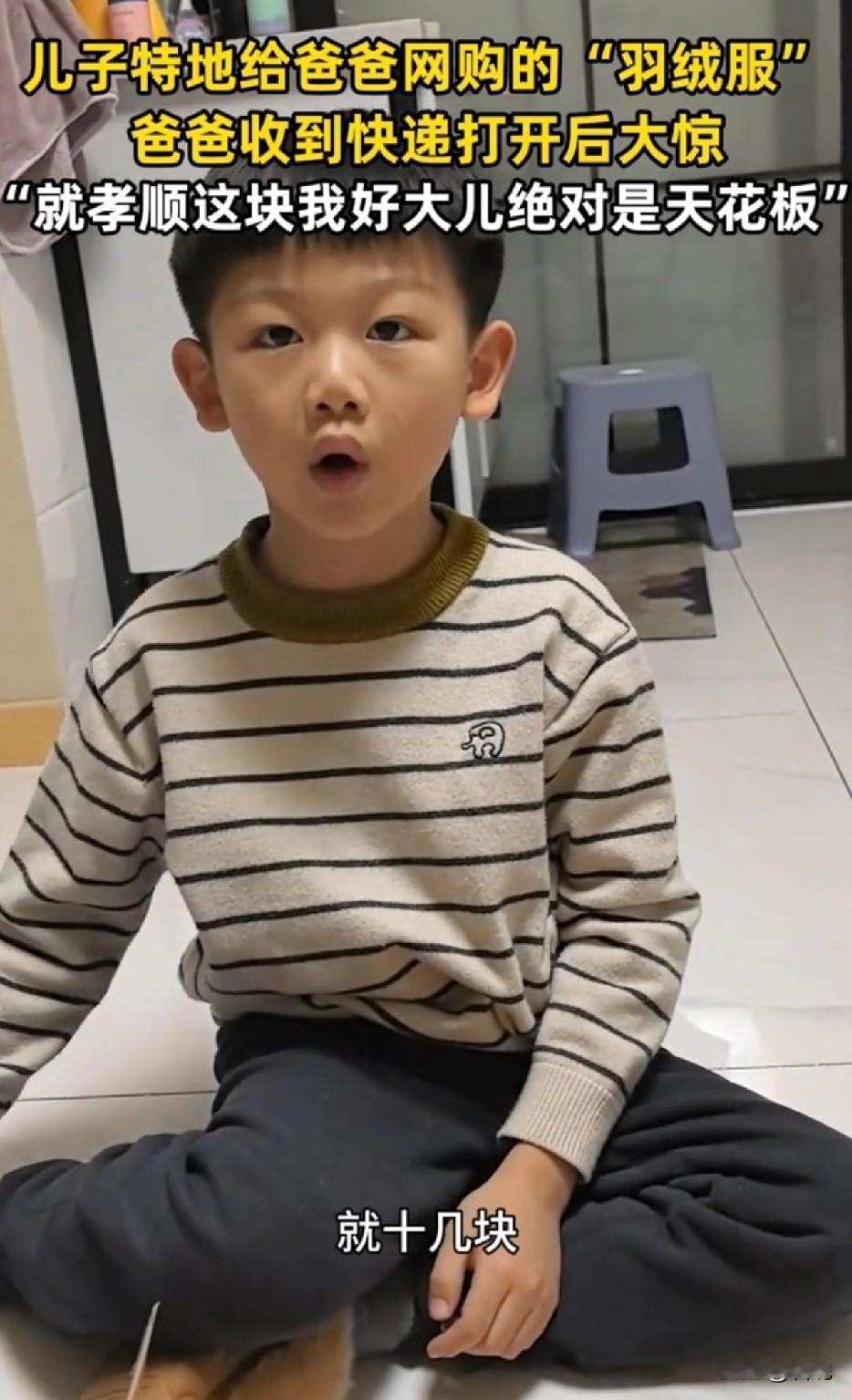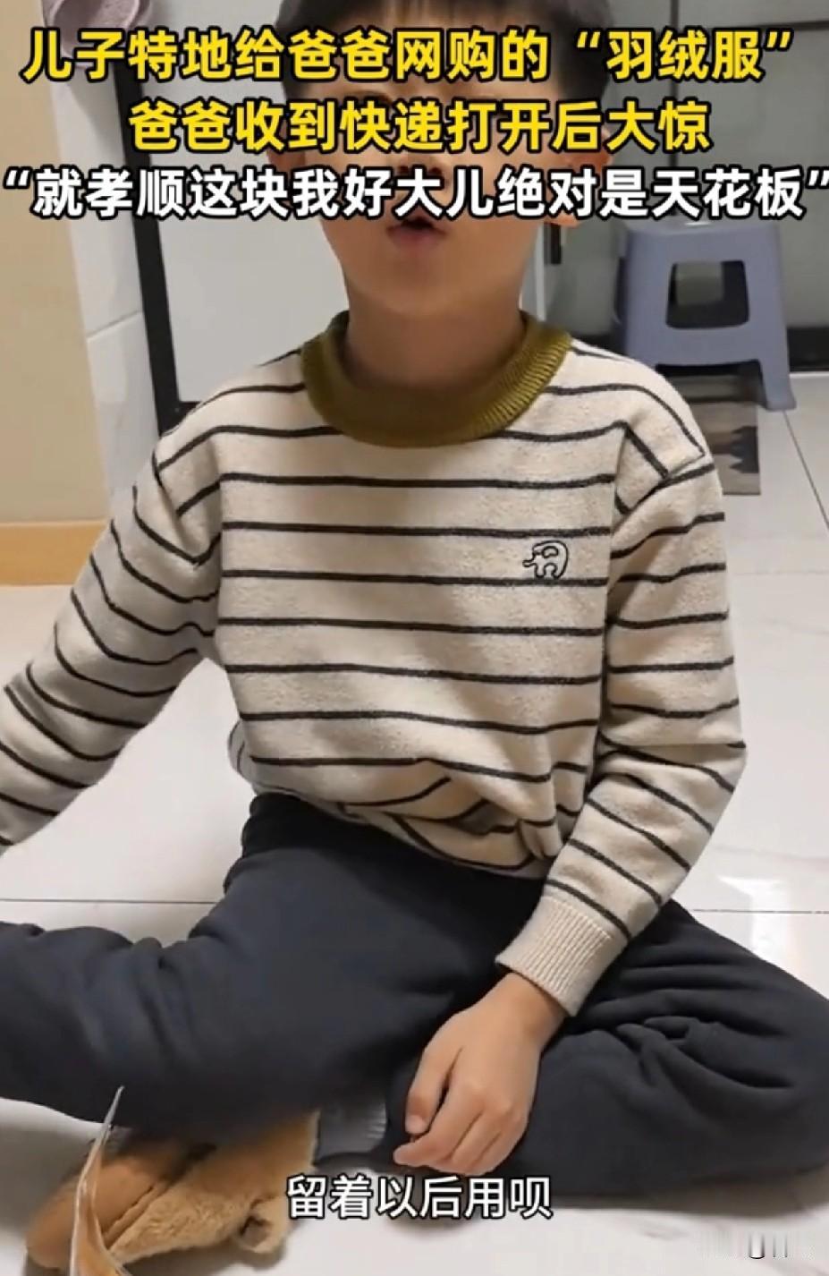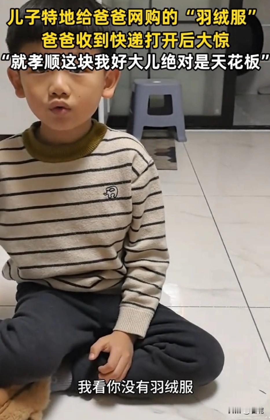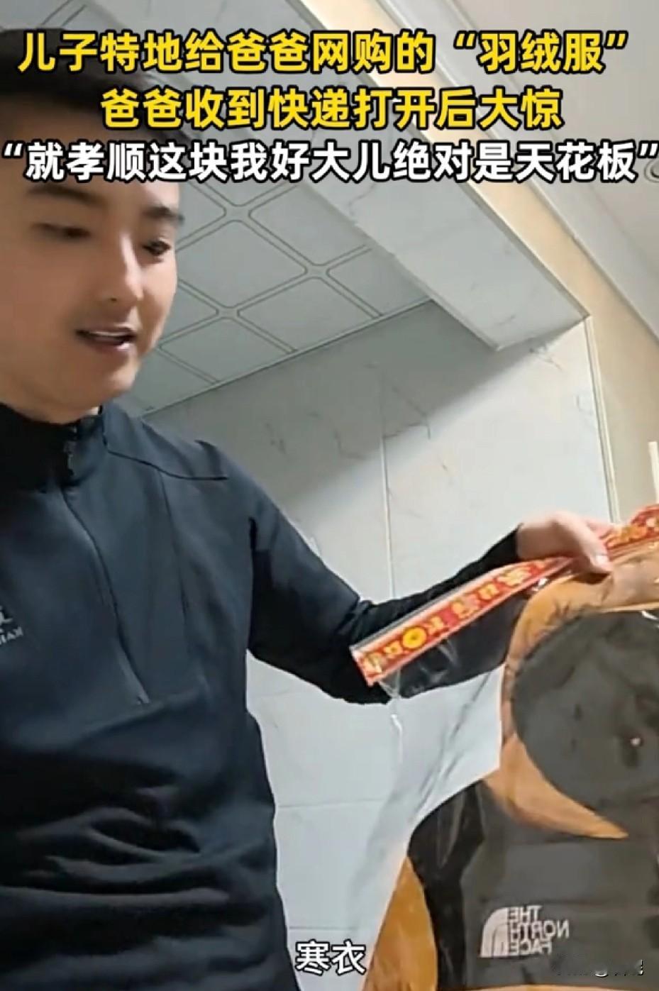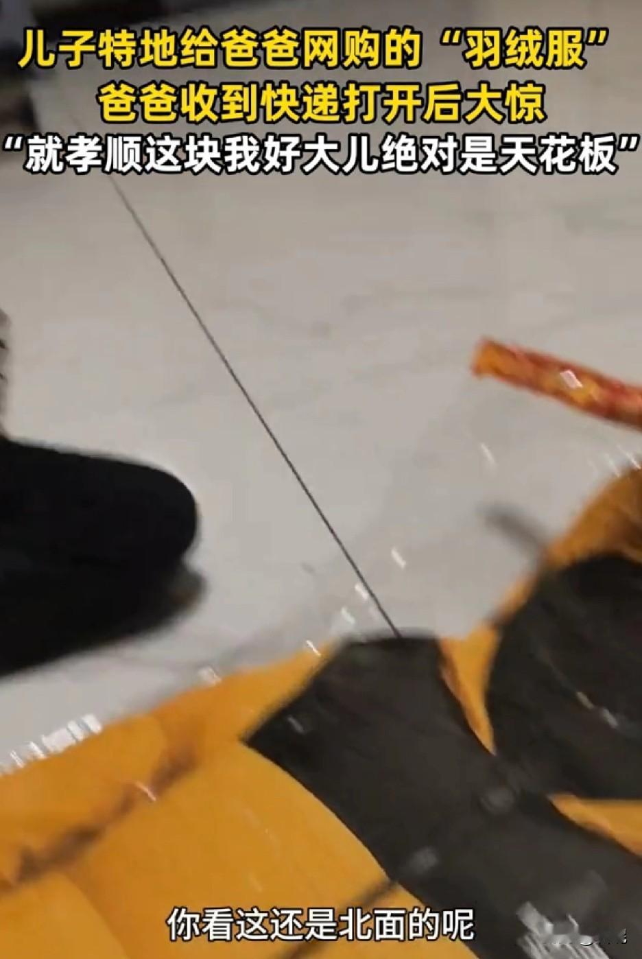 就孝顺这块,这儿子绝对是天花板! 吉林,一儿子看爸爸没有羽绒服,然后特地在网上网购了一件“羽绒服”。结果爸爸收到快递后打开一看,大吃一惊。 刚看视频,包装成这样,是啥大牌羽绒服压缩发货呢,结果老半天都没鼓起来。结果爸爸一解释,寒衣,寒衣羽绒服!一张纸!烧给死人用的。 “一看还是北面的”“就十几块”“留着以后用呗!” 你说这孩子不孝顺吧,还知道冷了给买羽绒服,你说这孩子孝顺吧,结果买得寒衣,还挑牌子的。你说让退货吧,孩子说留着以后用!迟早的事情! 这儿子绝对是亲生的,孝顺的天花板,没白养!