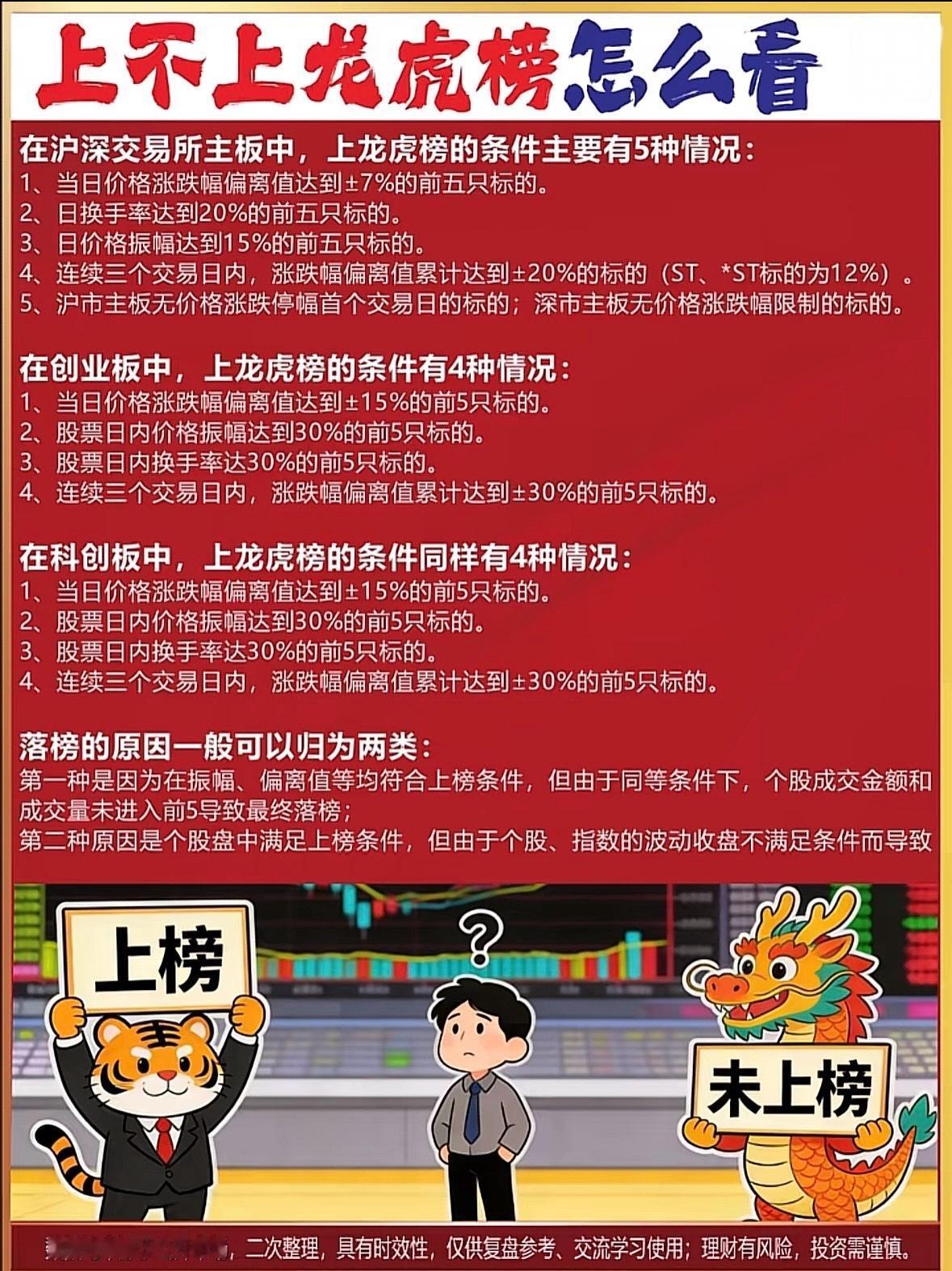 上龙虎榜的5种情况,你懂了吗? A股龙虎榜上榜条件:主板涨跌±7%、换手20%、振幅15%等;创业板/科创板±15%、振幅30%。落榜主因成交额未进前五或收盘未达标。数据仅供参考,投资需谨慎。