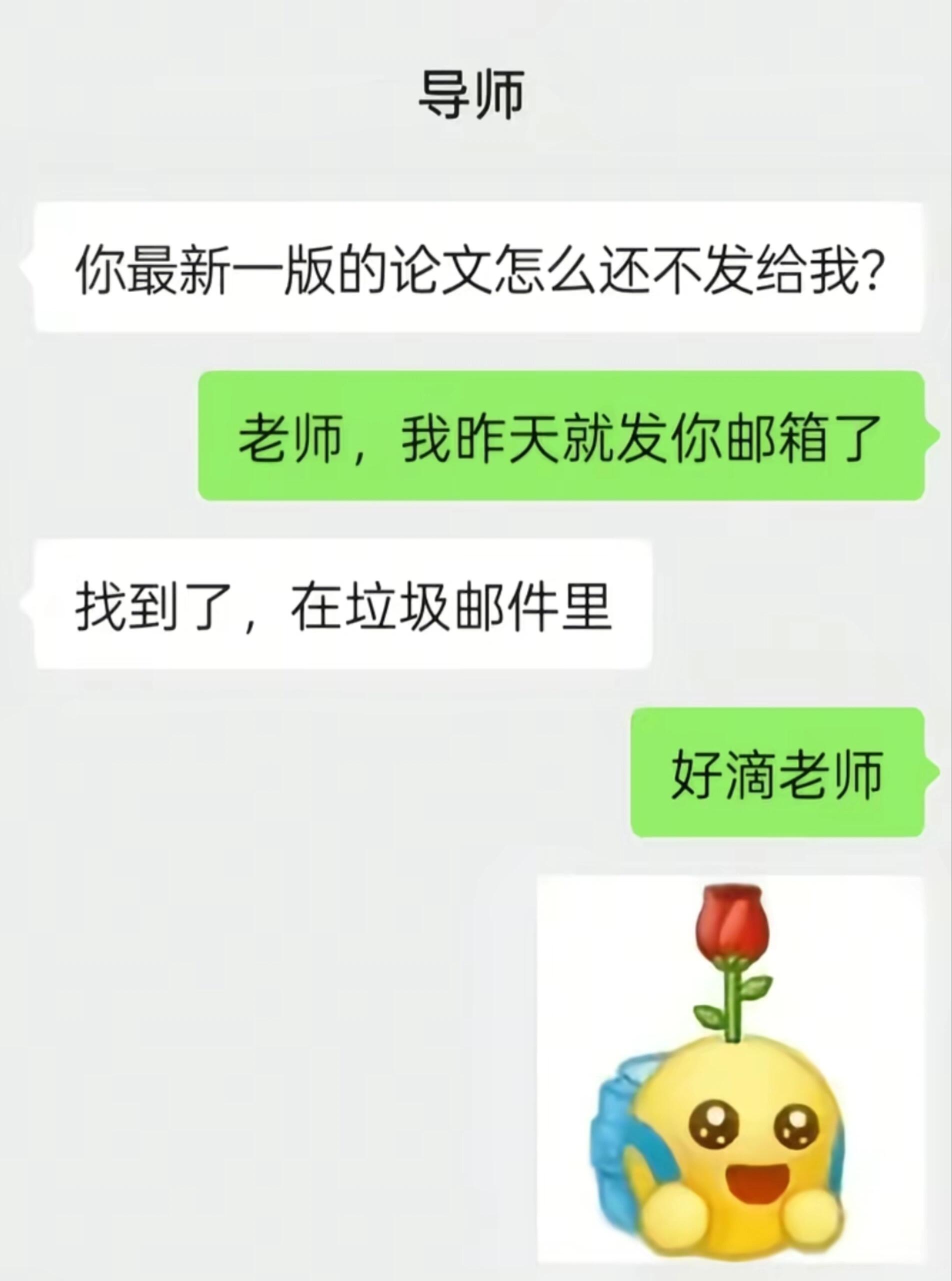 你最新一版的论文怎么还不发给我? 老师,我昨天就发你邮箱了 找到了,在垃圾邮件里