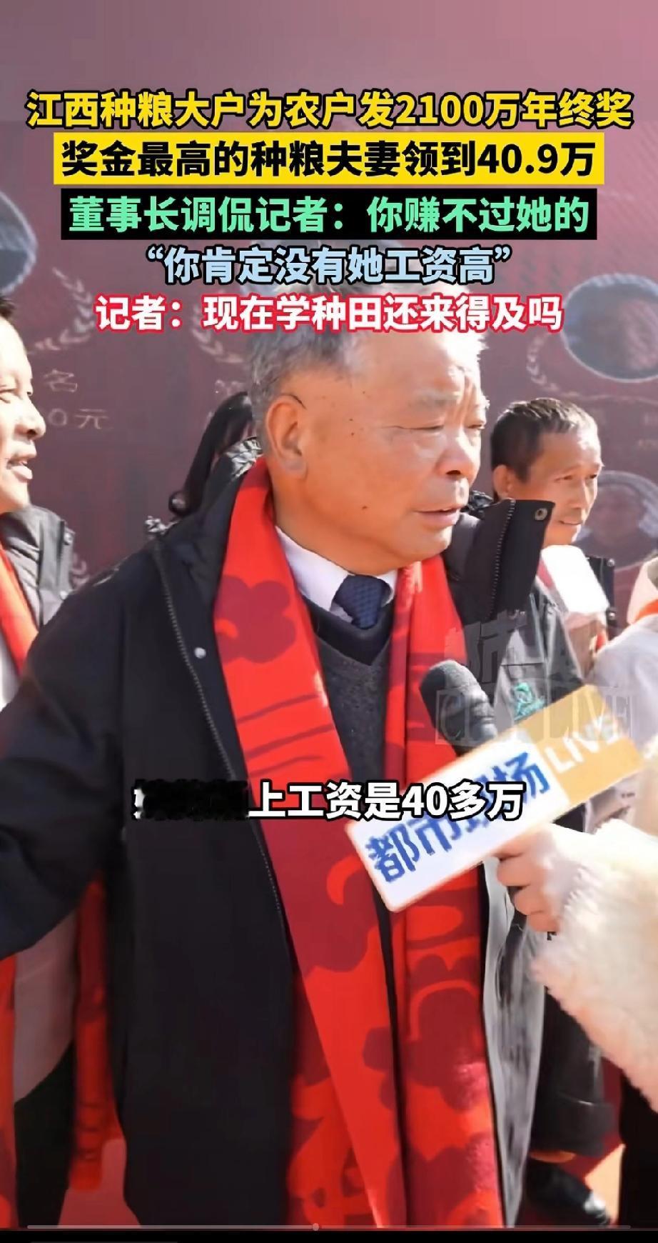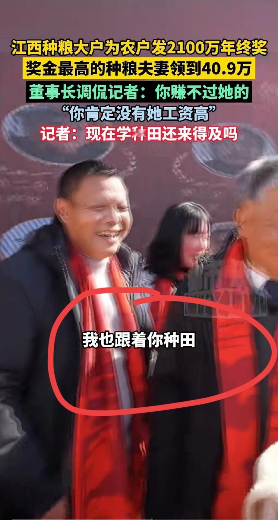 记者当场想去种田。 江西种粮公司为农民发2100万年底奖金。 奖金最高的农民夫妇领到了40.9万。 绿能农业董事长调侃记者:“你赚不过她的,你肯定没有她工资高” 记者:我也跟着你种田,现在学种田还来得及吗? 不过话说回来,他们种田能发财,也归于他们有地,我们福建这边,八山一水一分田。根本很多田地连机械设备都上不去,都是沼泽梯田。 因此我还是建议,因地制宜,福建还是适合招商引资新办工厂,而不是为了保护已经荒废很久,长满杂草,无人耕种的荒田,实际情况是,宁愿空着,也不给这荒田办工厂。 农业 农民
