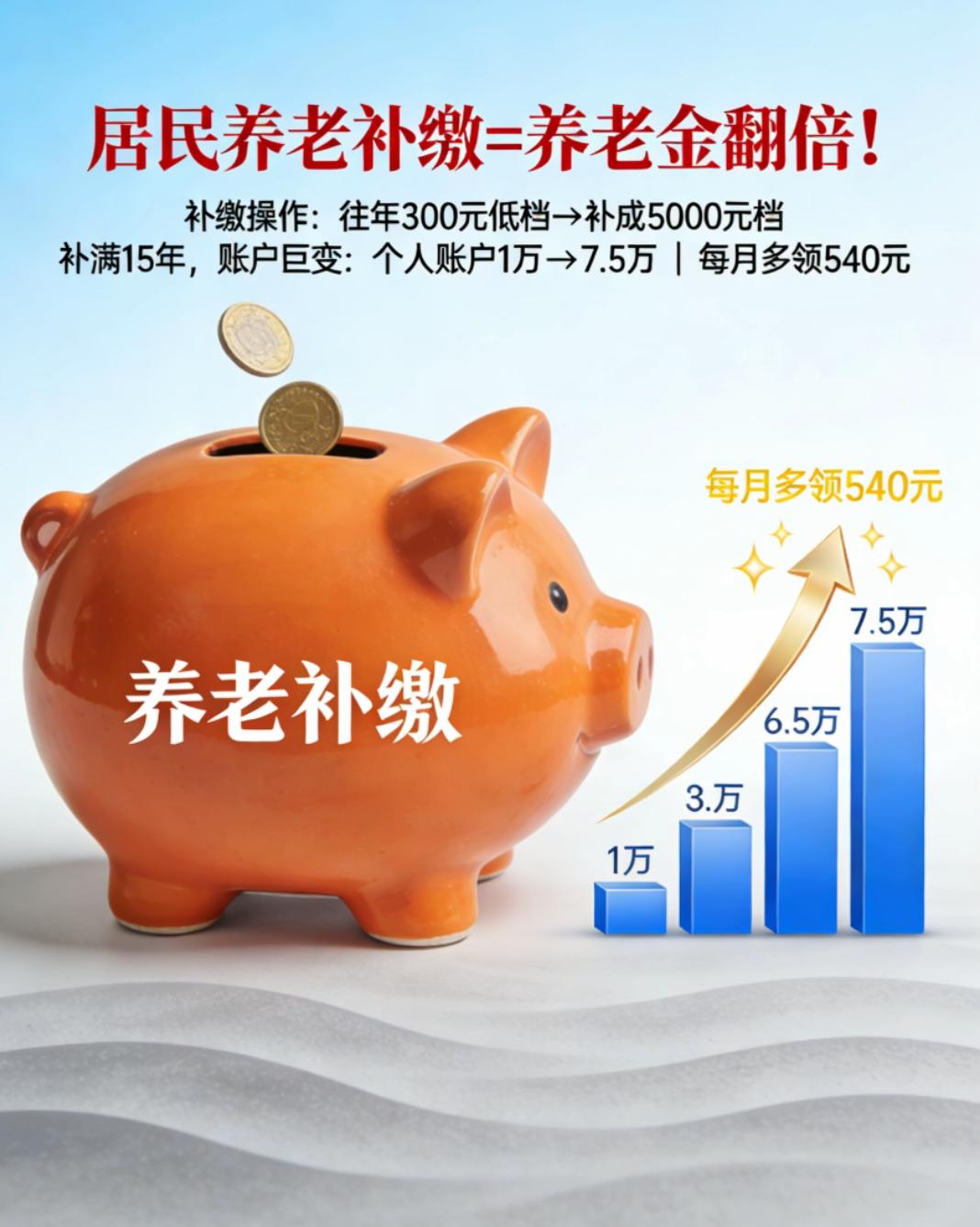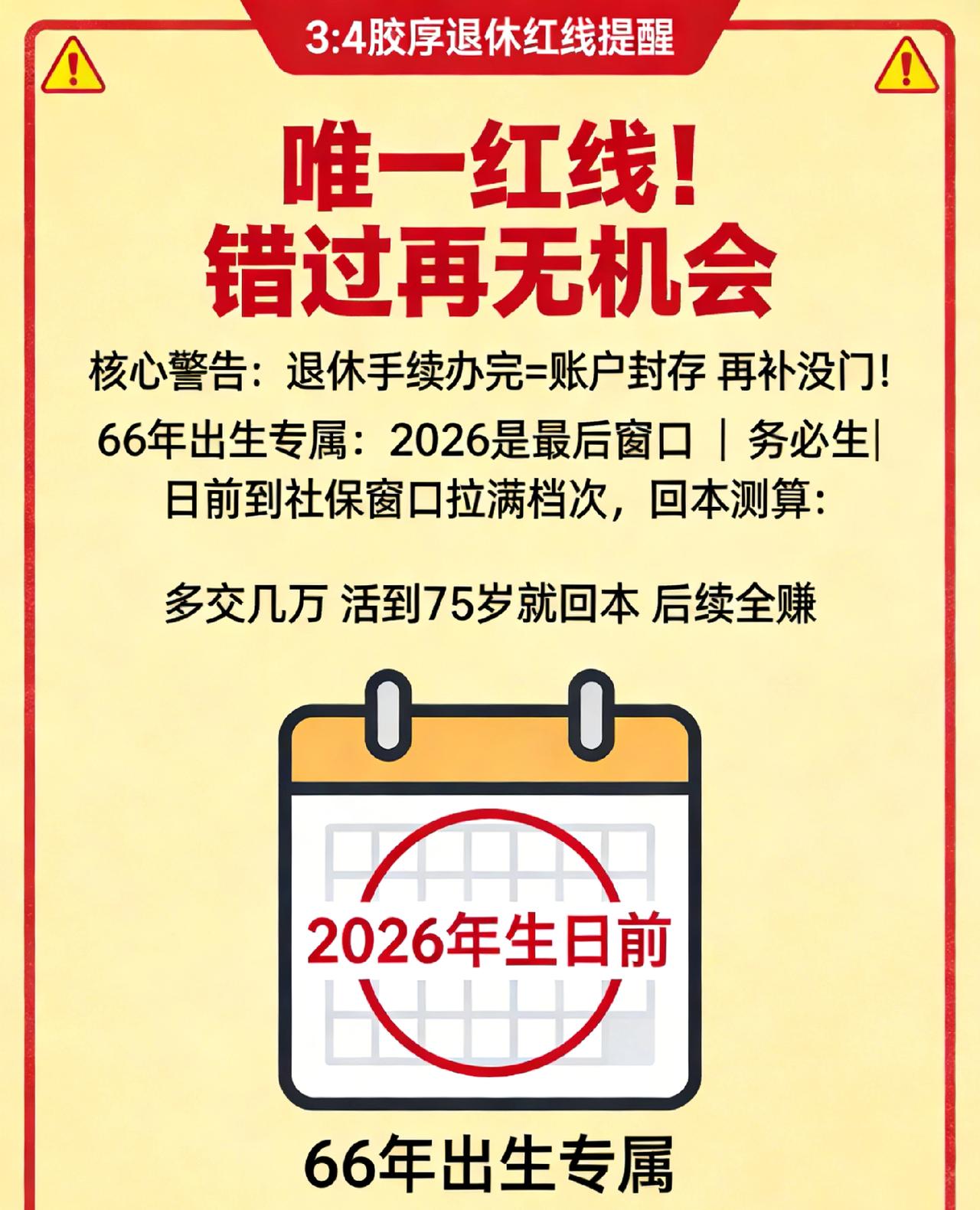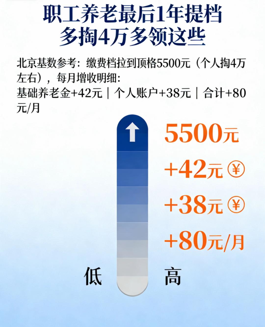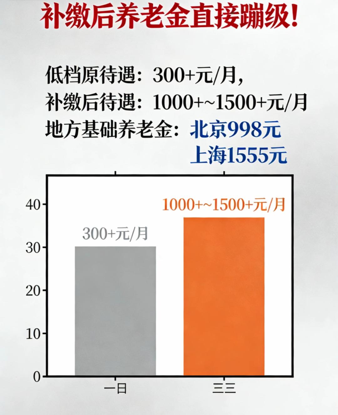最后一年多交几万,养老金能从三百变一千?66年出生注意了! 1966年出生的男职工,2026年就到点退休,但今年起得先“多干”4-6个月。别小看这半年,账一算就明白: 按北京基数,最后一年把缴费档次从最低拉到顶格(5500元),个人再多掏4万左右,基础养老金每月就能多拿42元,个人账户再多38元,合计80元/月。 关键在“补缴”:城乡居民养老允许一次性把往年300元的低档补成5000元档,补满15年,个人账户瞬间从1万变成7万5,每月光这块就多540元;再加上地方基础养老金(北京998元、上海1555元),总待遇直接从300+蹦到1000+甚至1500+。 但红线只有一条:一旦办完退休手续,账户封存,再补没门!66年出生的,2026就是最后窗口,想“翻身”的,务必在生日前去社保窗口把档次拉满。 一句话:最后一年冲顶格,几万换每月多几百,活到75岁就回本,后面全是赚。赶不上这趟车,余生每月少拿一半!