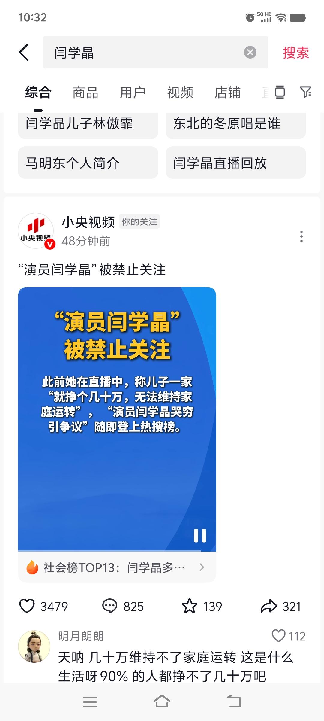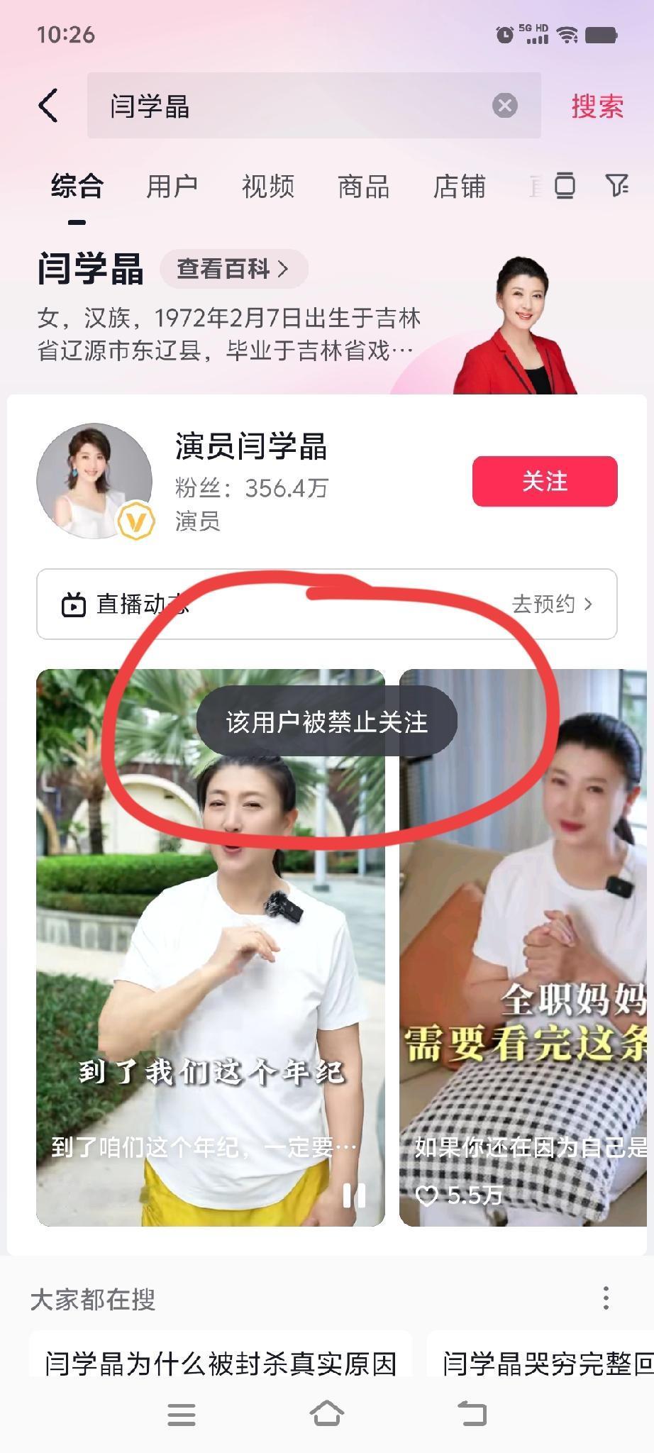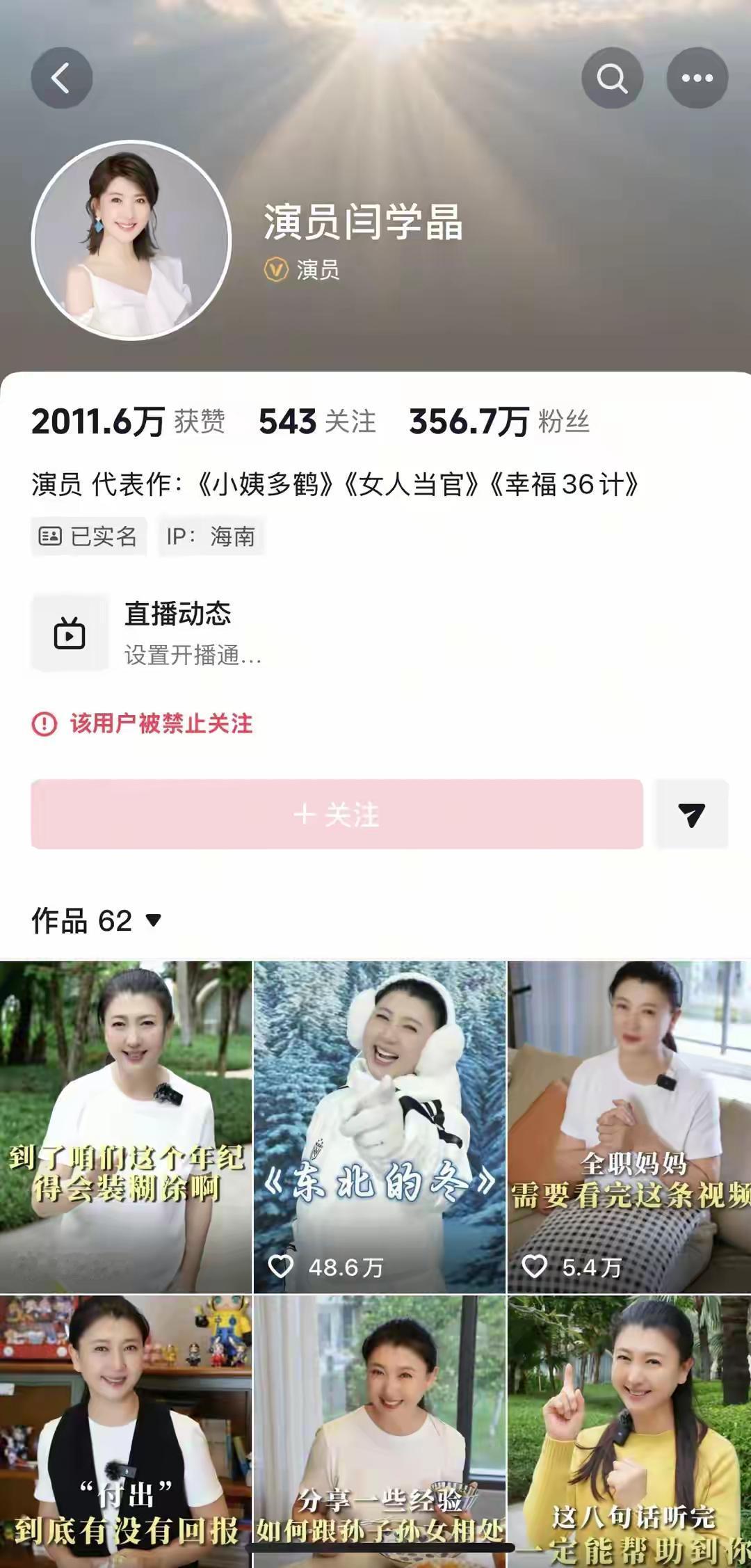 刚看到“闫学晶”被禁止关注了。 伟大的人民表演艺术家闫学晶老师因为“就赚几十万”哭穷的言论,冲上热搜。 不少农村大爷大妈,非常善良热心,听到闫学晶老师儿子在北京生活遇到困难,不仅有想捐鸡蛋,土豆,玉米,公鸡的, 还有热心大爷哭着想把低保的名额让给她[捂脸]。 虽然网络上很多视频都是搞笑调侃,但是,也真实反映出,人民不希望看到有些人为富不仁,明明生活过得已经比我们好百倍,还不满足,还说一些不符合共同富裕的话来刺激我们的心灵!因此,支持这样的人被禁止关注!