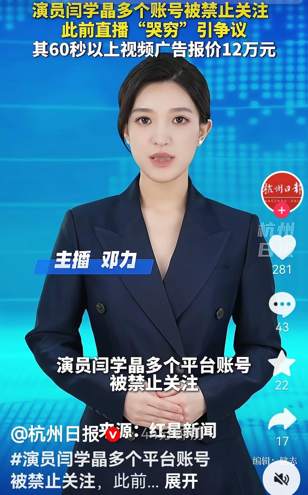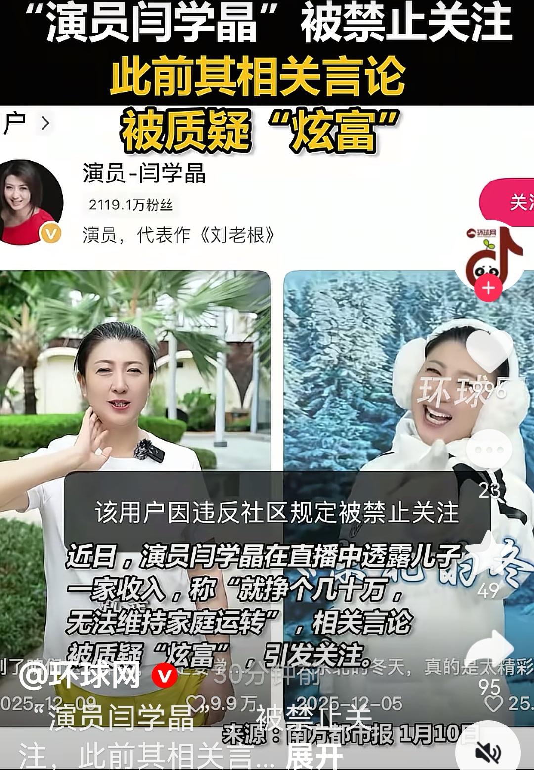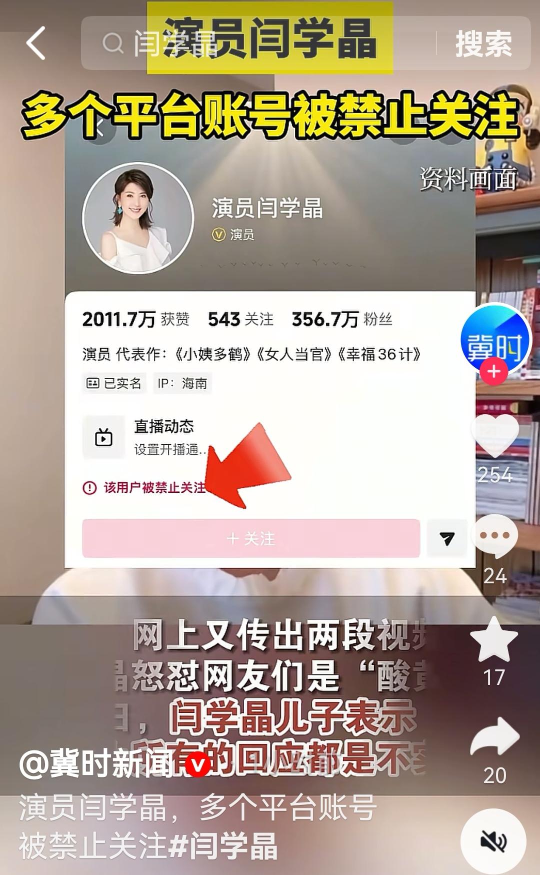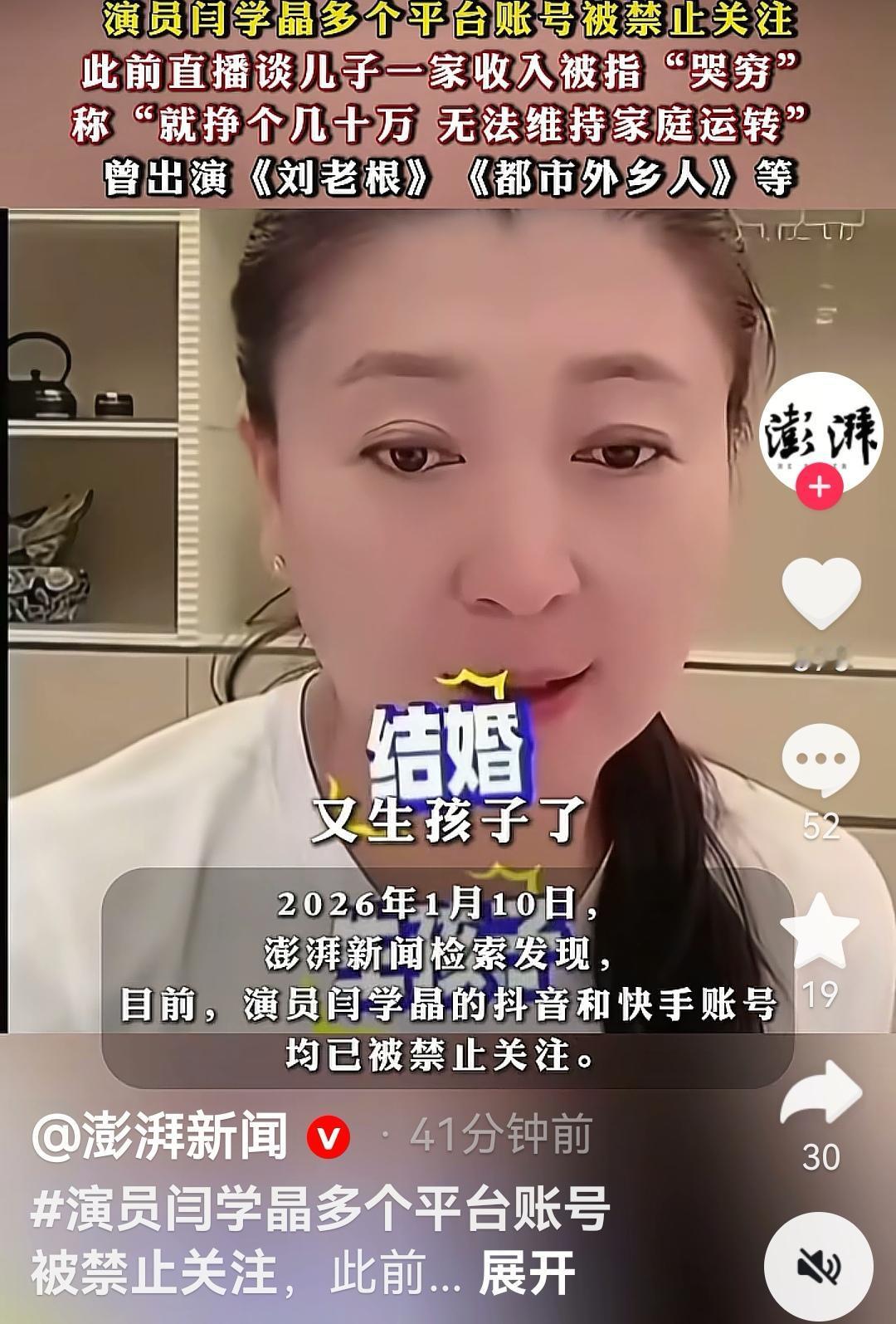 演员闫学晶的抖音和快手账号被禁止关注,小央视频、环球时报、澎湃新闻、红星新闻、津云、海报新闻等多个账号报道了此消息。闫学晶 酸黄瓜