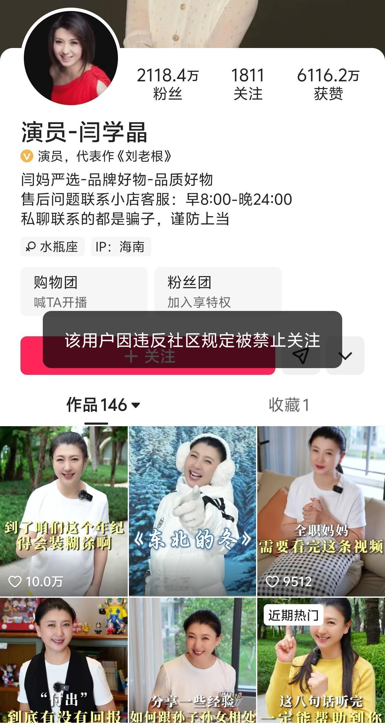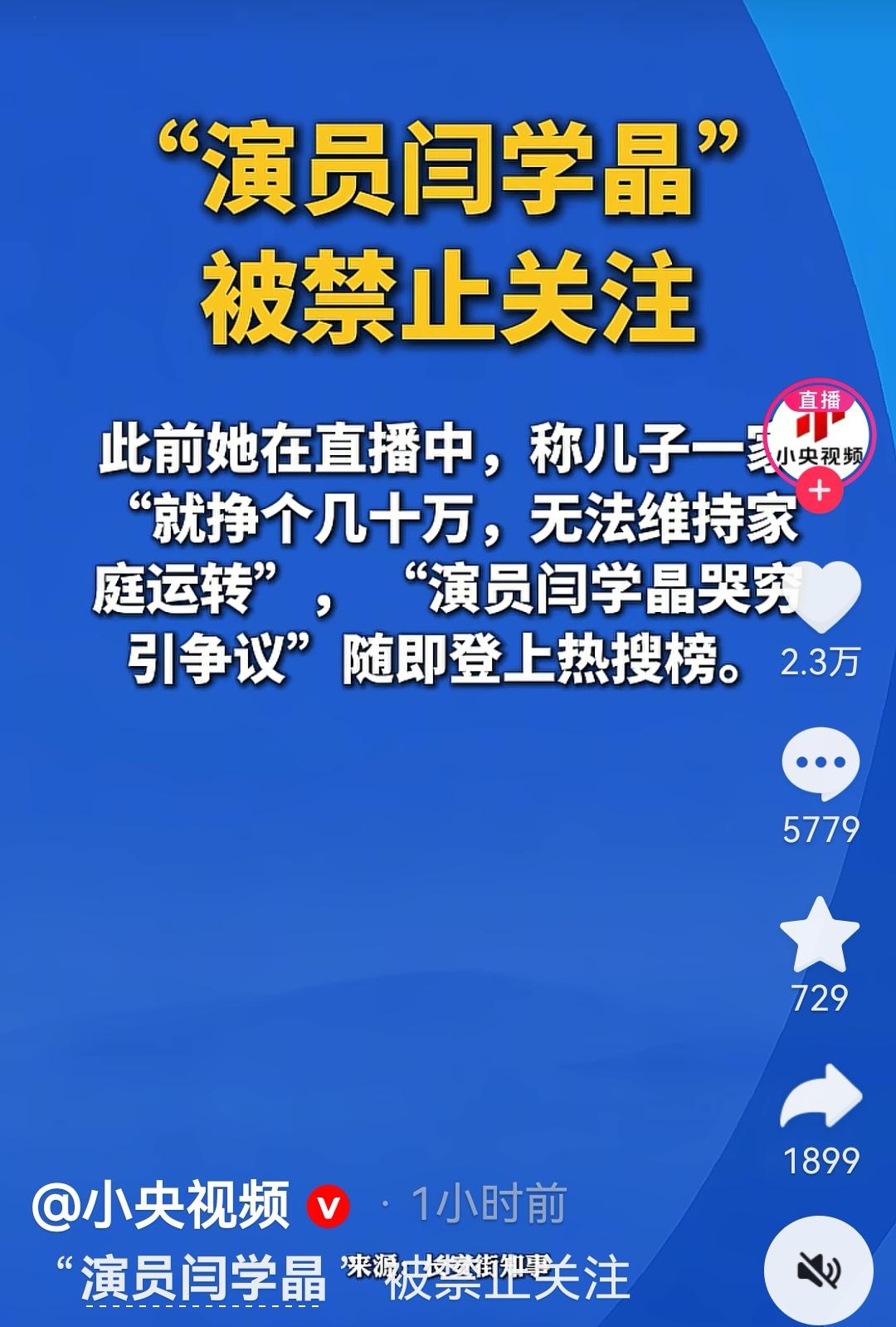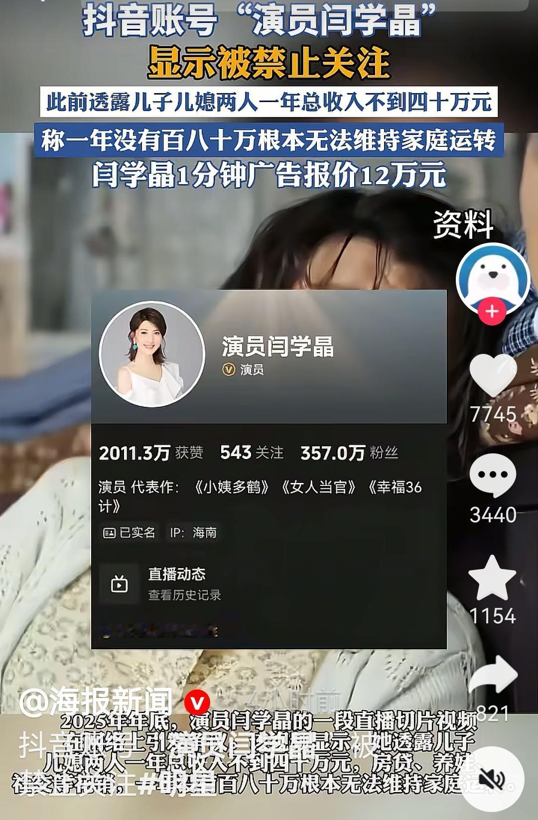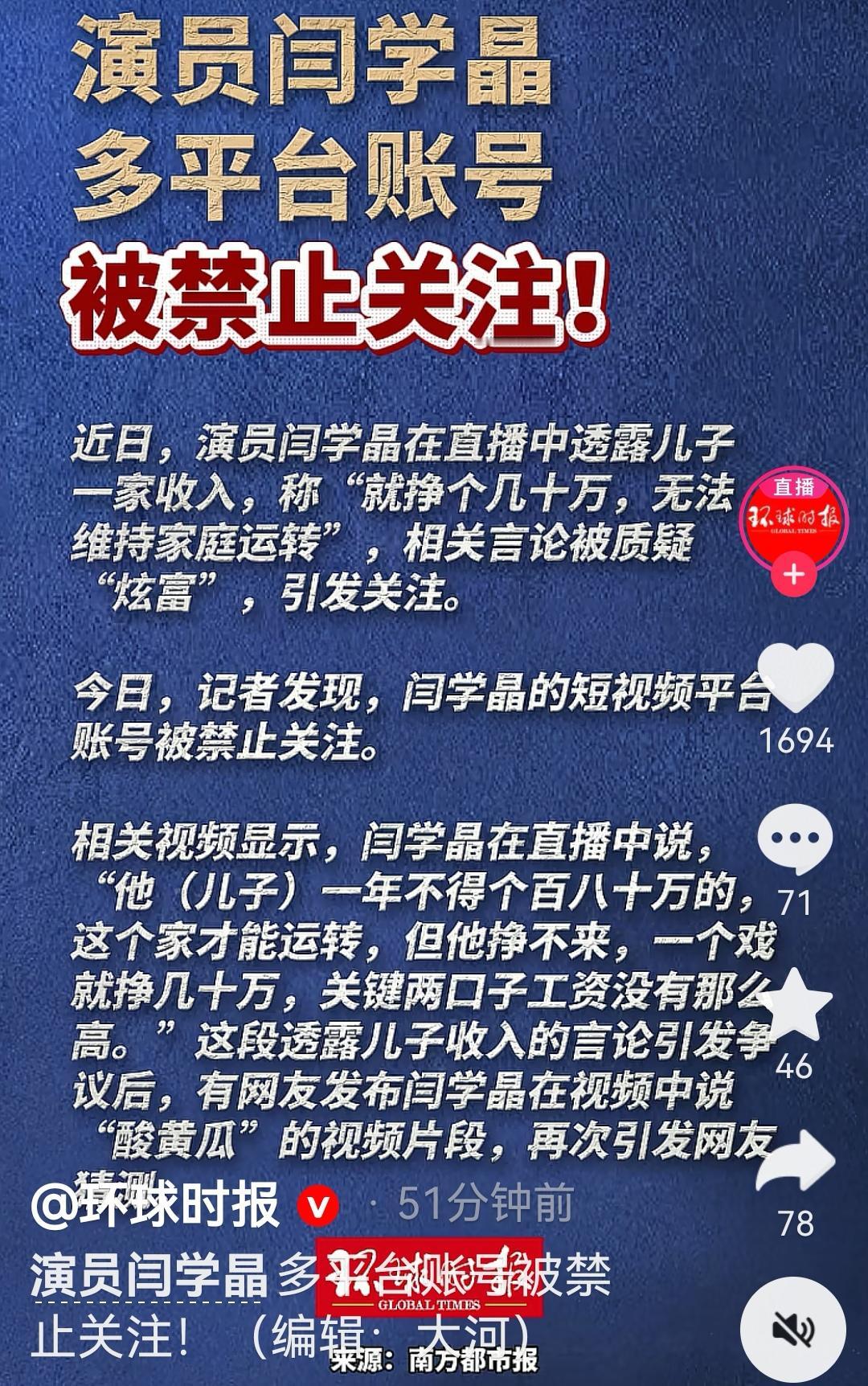 演员闫学晶的抖音和快手账号被禁止关注,小央视频、环球时报、澎湃新闻、红星新闻、津云、海报新闻等多个账号报道了此消息。闫学晶 酸黄瓜