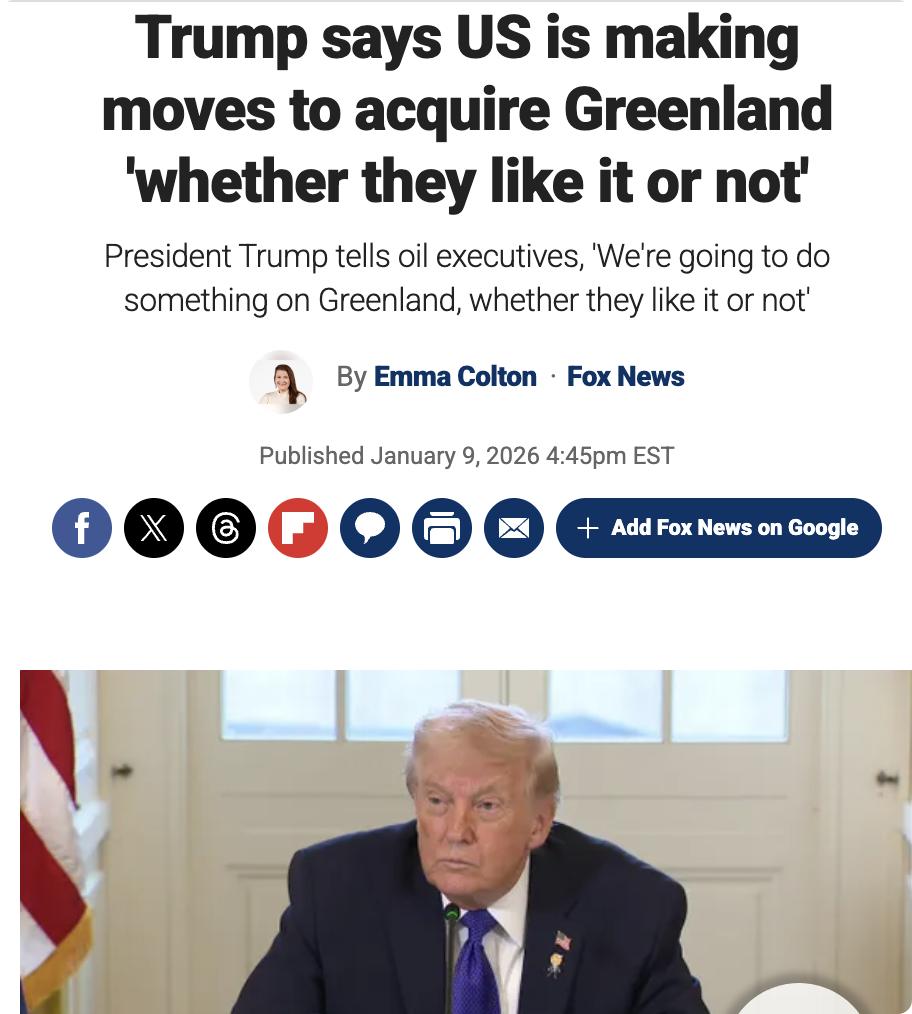外媒:美国总统特朗普在2026年1月9日表示,美国将采取行动收购格陵兰岛,无论丹麦是否同意。 特朗普在与石油高管会面时强调,若美国不行动,俄罗斯或中国可能会控制格陵兰岛,这将使美国面临不友好的“邻居”。他还提到,美国需要从国家安全角度拥有格陵兰岛,因为该地区目前有大量俄罗斯和中国的船只。 特朗普希望与丹麦达成协议,否则将采取更艰难的方式。欧洲多国领导人反对美国的这一计划,强调北极安全应由北约盟友共同保障,丹麦也明确表示格陵兰岛的事务应由丹麦和格陵兰岛人民自行决定。