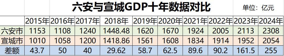 十年前看六安与宣城两市的GDP时,我感觉宣城应该很快超过六安,最接近的2018年