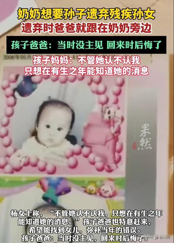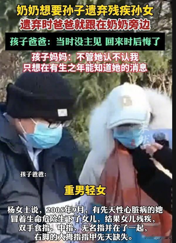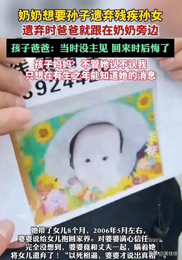 重男轻女的老观念,居然成了抛弃亲孙女的借口?河南郑州这位杨女士,2005年冒着生命危险生下女儿,孩子虽有残疾,却是她捧在手心里的宝。可仅仅8个月后,婆婆以“带回家养”为由,竟和孩子爸爸一起把娃遗弃了,只因为想要孙子! 如今这么多年过去,爸爸说当初没主见、回来就后悔了,可这份迟来的愧疚,怎么抵得过孩子妈妈二十多年的思念?杨女士只求能知道女儿的消息,哪怕孩子不认自己也没关系。 重男轻女的思想有多可怕?它能让人丢掉为人长辈的慈爱,忘掉为人父母的责任。血缘亲情不该被性别偏见绑架,遗弃孩子更是触碰法律和道德的底线,希望这个孩子能早日被找到,也希望这种荒唐的观念再也别伤害任何人。