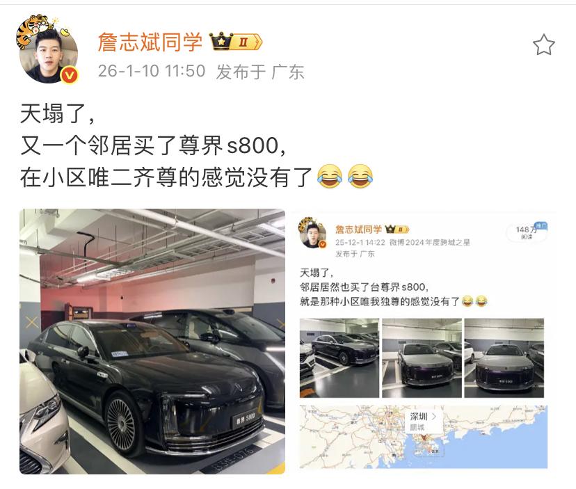 詹志斌:天塌了,又一个邻居买了尊界S800,在小区唯二齐尊的感觉没有了[笑哭][笑哭] 这说明这个小区的业主认可这款车的挺多的呀,现在已经三辆尊界S800了,随着时间的延续,还会有越来越多的人购买尊界S800。 黑色版本看起来还挺好看的,看起来颜色比较低调,还符合绝大多数人的使用需求。 大家是怎么看的?欢迎评论区留言。